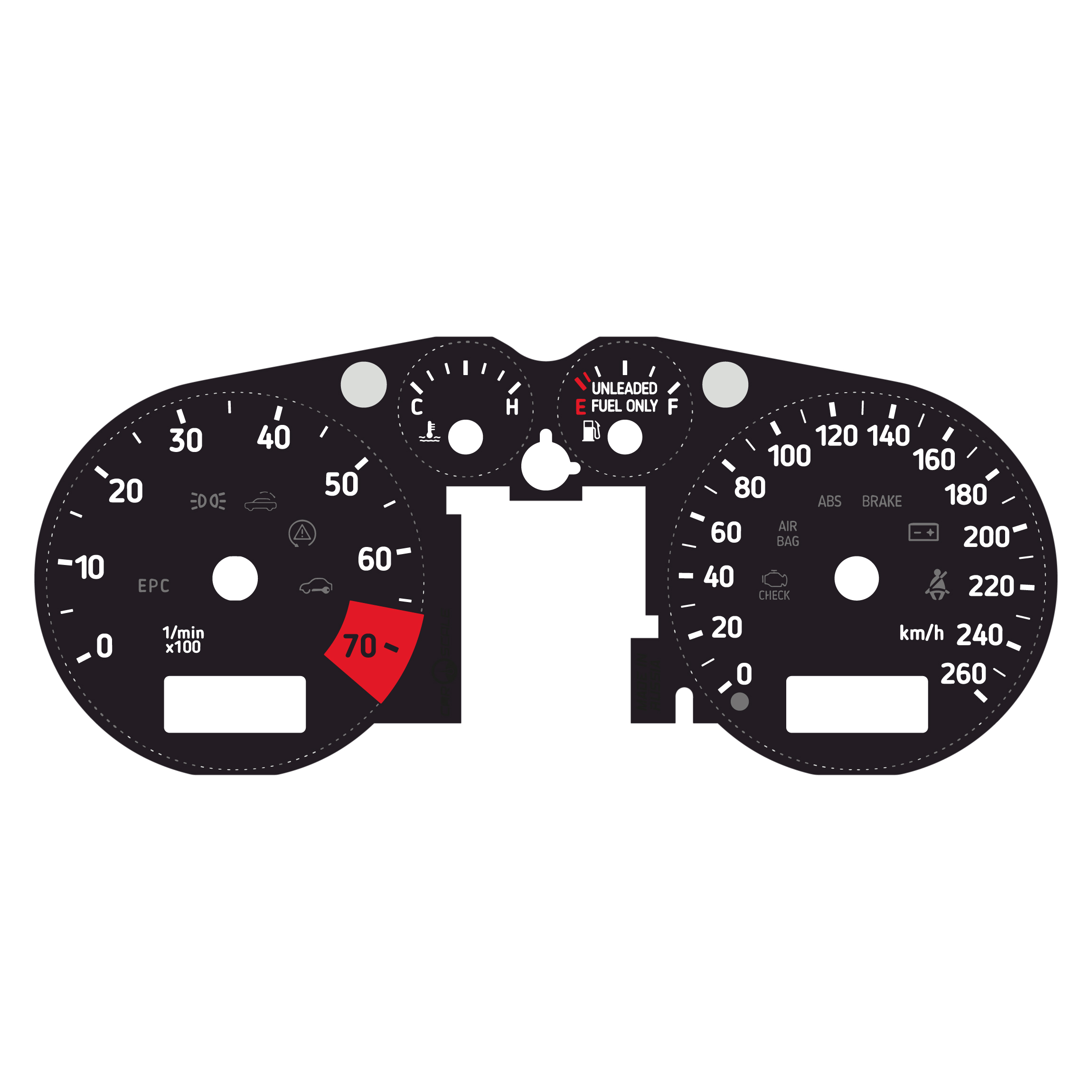 Printed directly on high quality dense plastic with UV printing technology for deep and rich colors. Laser engraving preserves details sharp and crisp. Anti-glint finish makes the surface matt and smooth. The gauge face is pre-cut with precision laser and ready to be installed. All warning lights and icons are the same as original and match OEM placement.