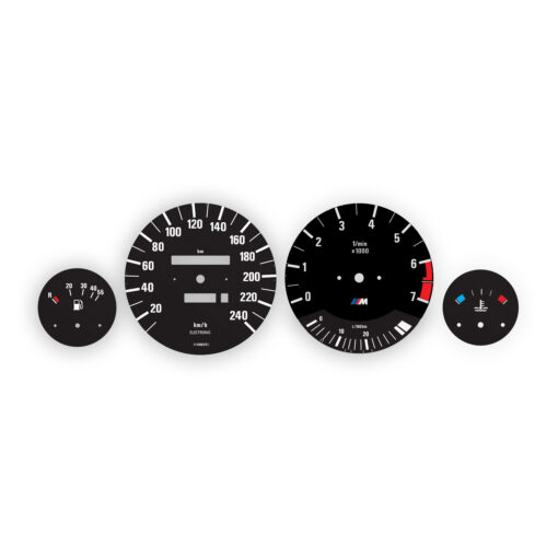 BMW Instrument Gauge Faces Replacement Dials – E30 320 / 323i, 140 mph / 240 kmh Speedometer + 7000 RPM Tachometer with M logotype – Black.