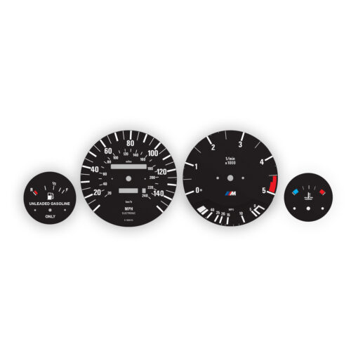 BMW Instrument Gauge Faces Replacement Dials – E30 325e,140 mph/240 kmh Speedometer + 5000 RPM Tachometer with M logotype – Black.
