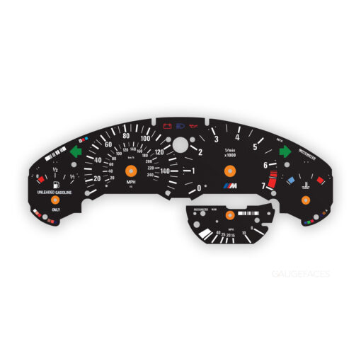 Gauge face for BMW E36 323i/323is – 140 mph / 240 km/h speed range, 7000 RPM with M logotype – Black.