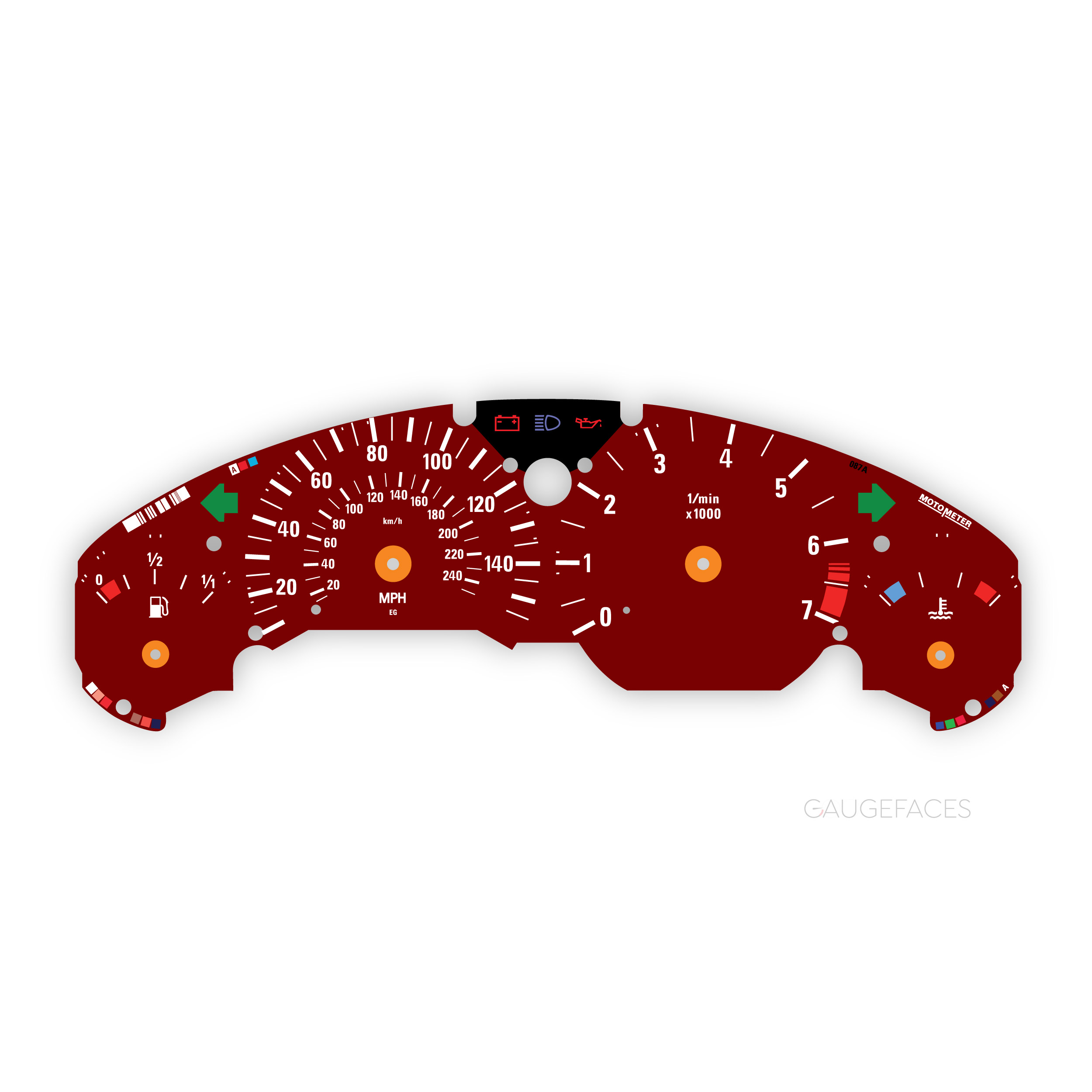 Gauge face for BMW Z3 (1995-2002) – 140 mph / 240 km/h speed range, 7000 RPM – Dark Red.
