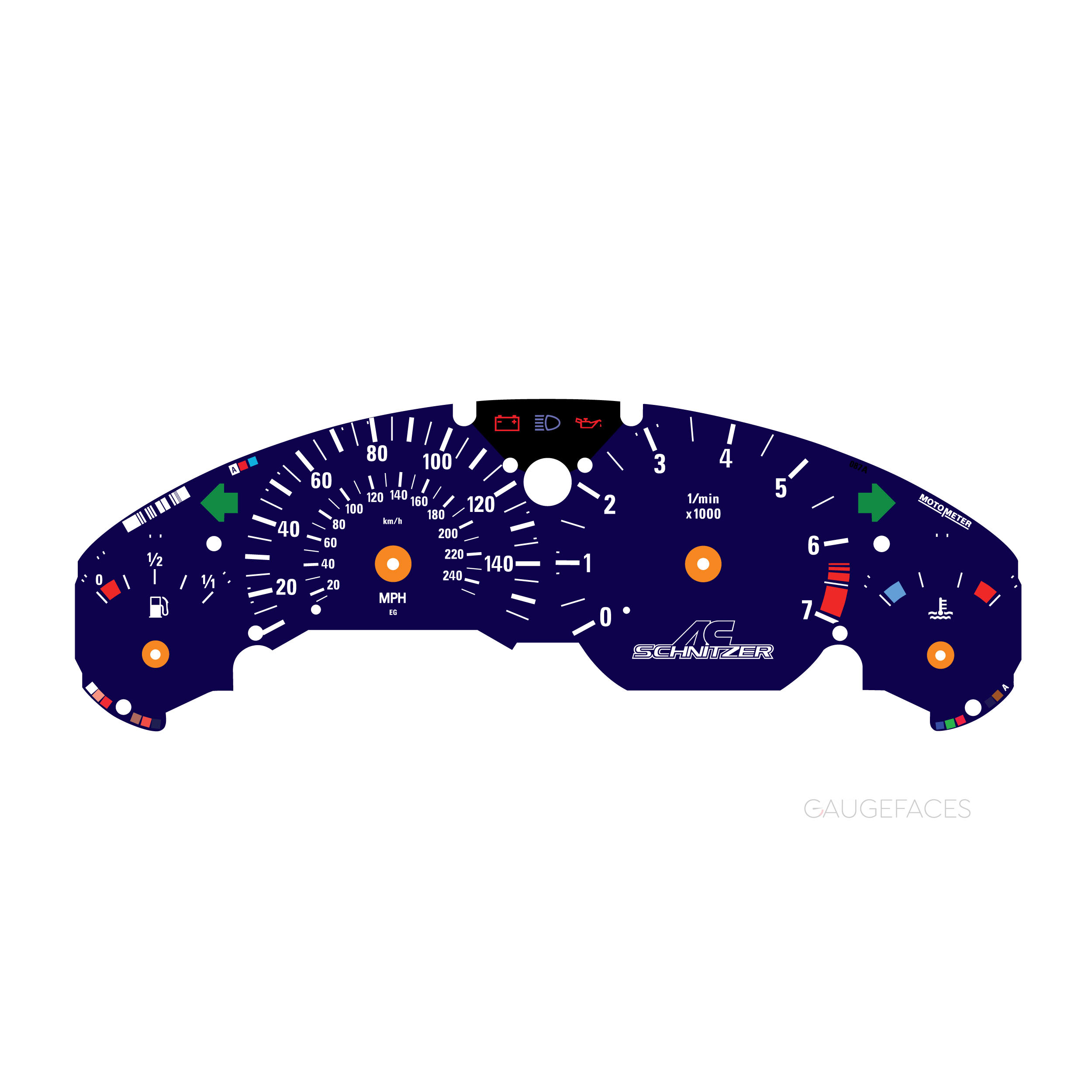 BMW E36 Z3 Instrument Cluster Replacement Gauge Faces – AC Schnitzer Logo – 140 mph / 240 kmh, 7000 RPM – Dark Blue.