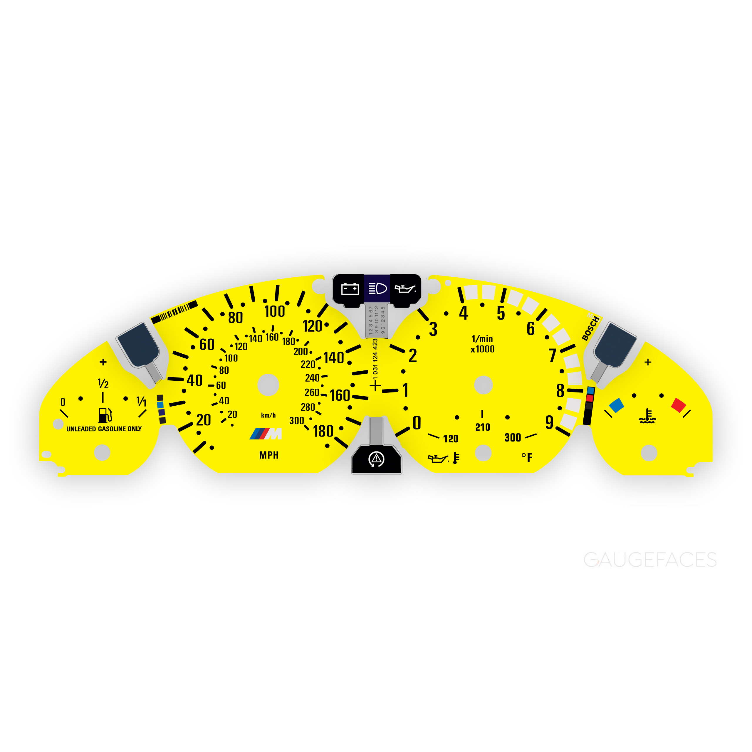 Instrument Gauge Face Replacement for BMW E46 M3 – 180 MPH / 300 KMH Speedometer with 9000 RPM Tachometer – Yellow.