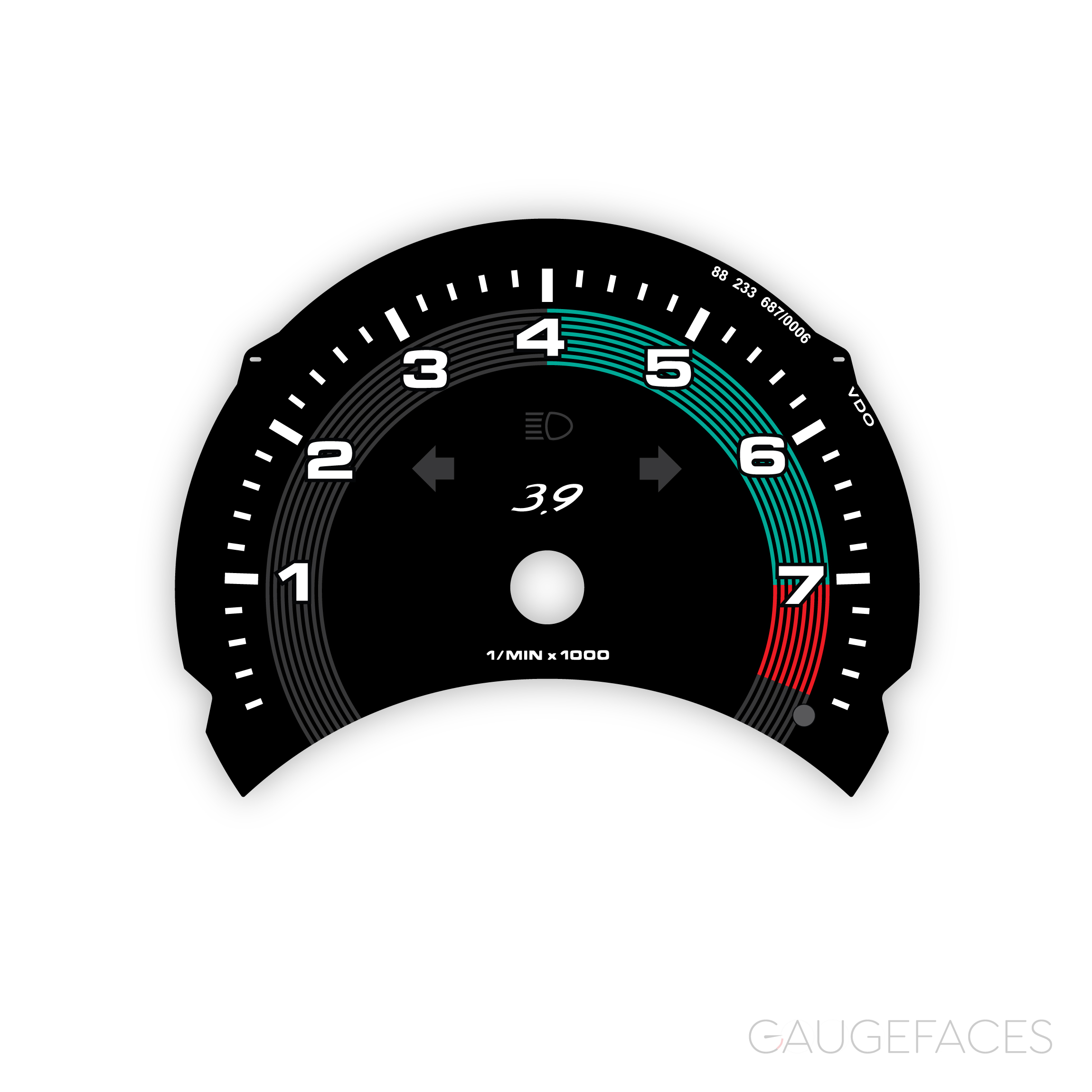 Instrument gauge face tachometer (rev counter) for Porsche 911 996.1 / Boxster 986.1 – 8000 RPM – 3.9 Logo – Black with Retro Style Green-Red Accent Ring.
