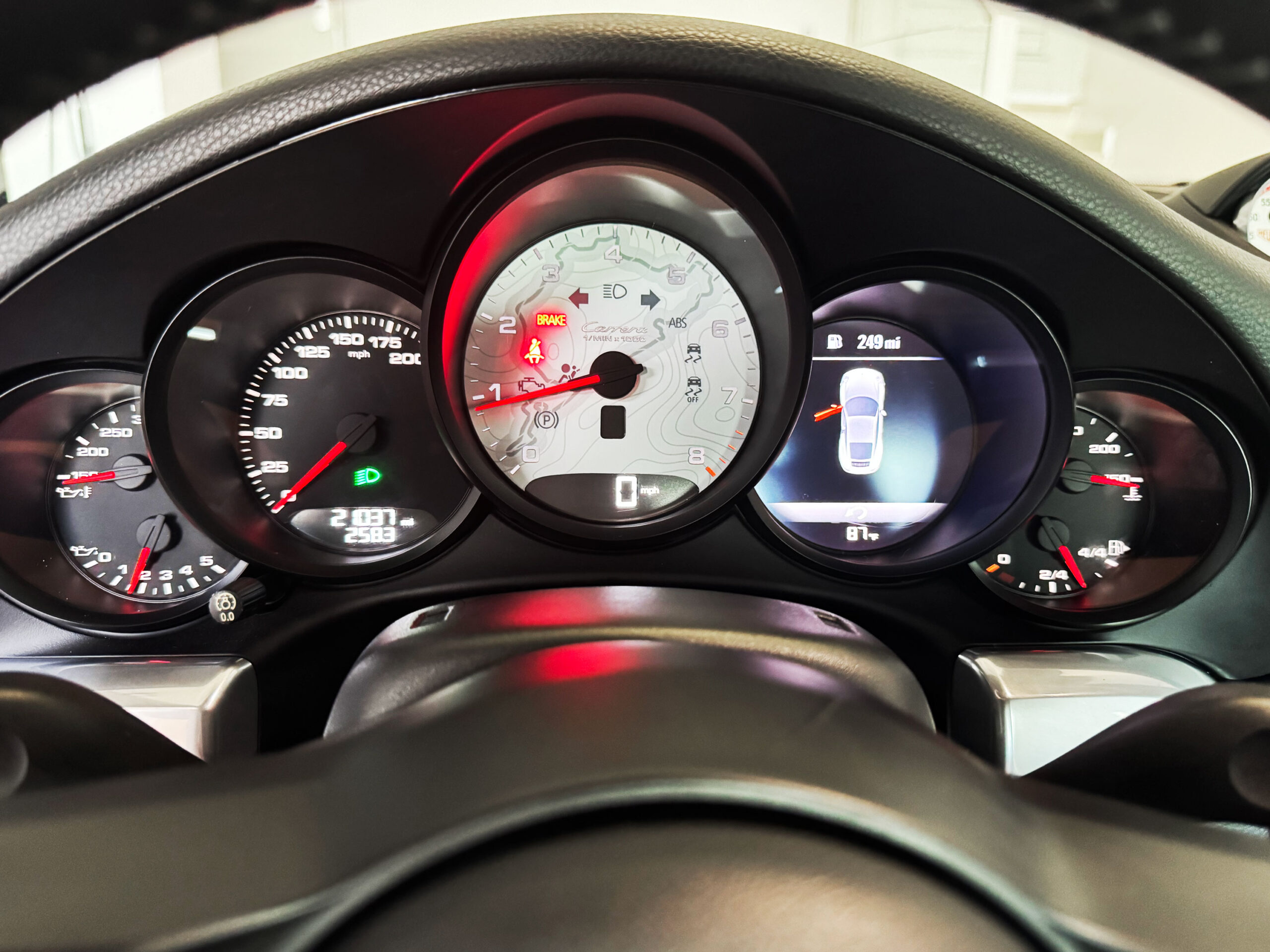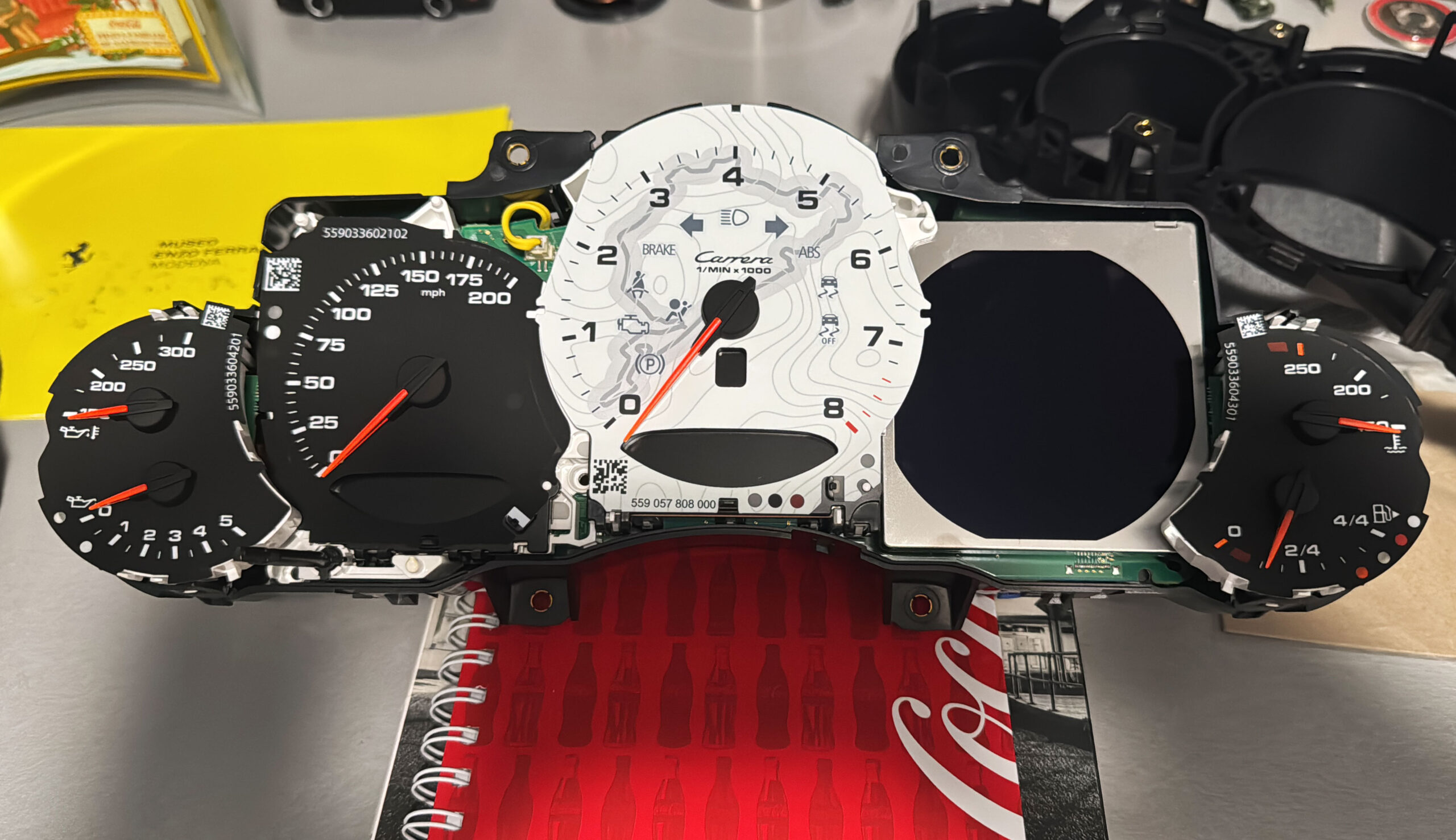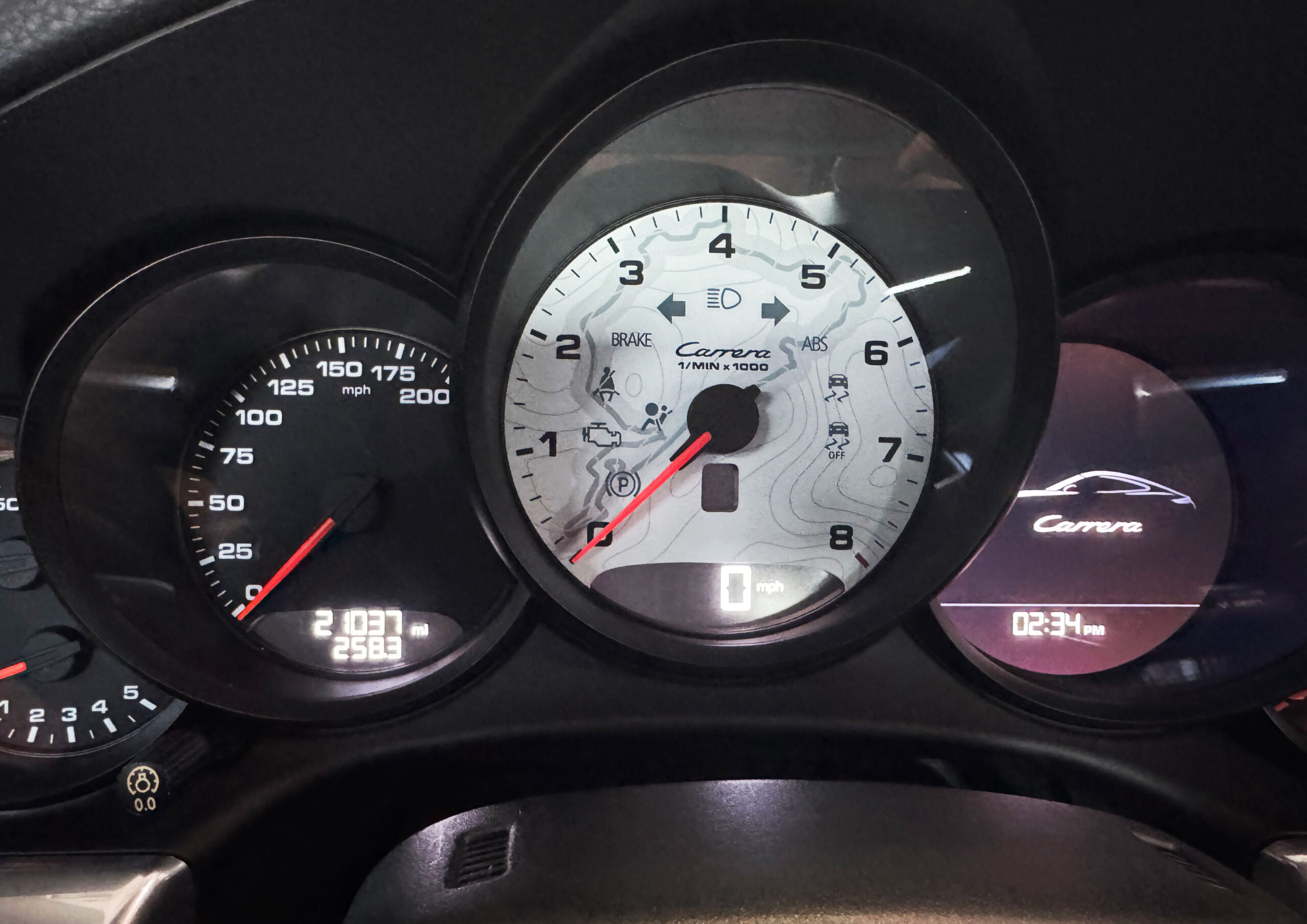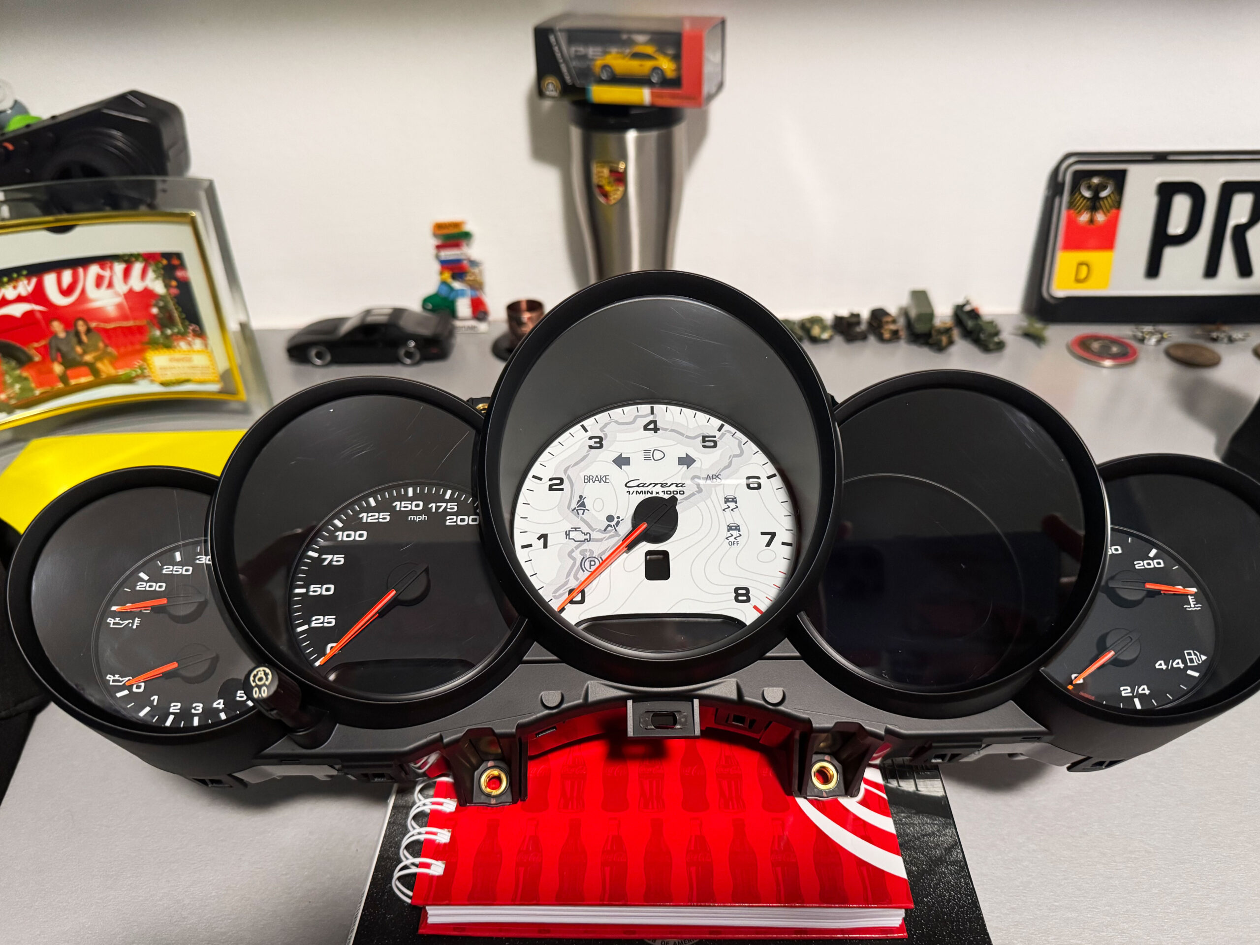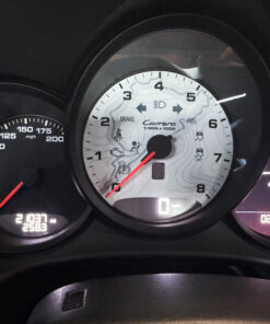 Gauge face tachometer with Carrera logotype for Porsche 911 991.2, for 8000 RPM, Manual transmission – White with Nurburgring contour.