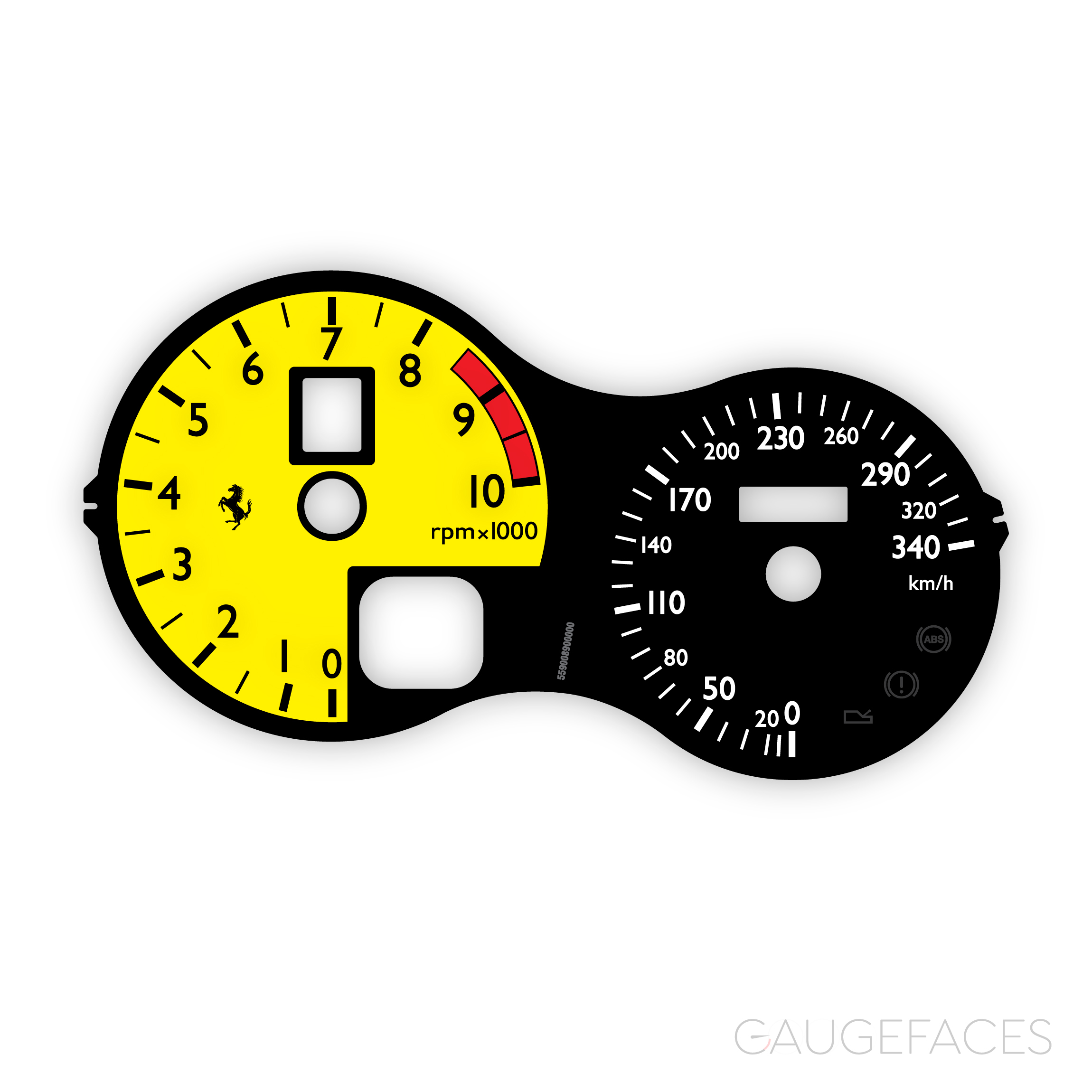 Ferrari F360 (Type F131, 1999-2005) / F430 (Type F131 EVO (F430 2004-2009) Dashboard Gauge Face – Stradale Look – OPTIONS – Black / Yellow.