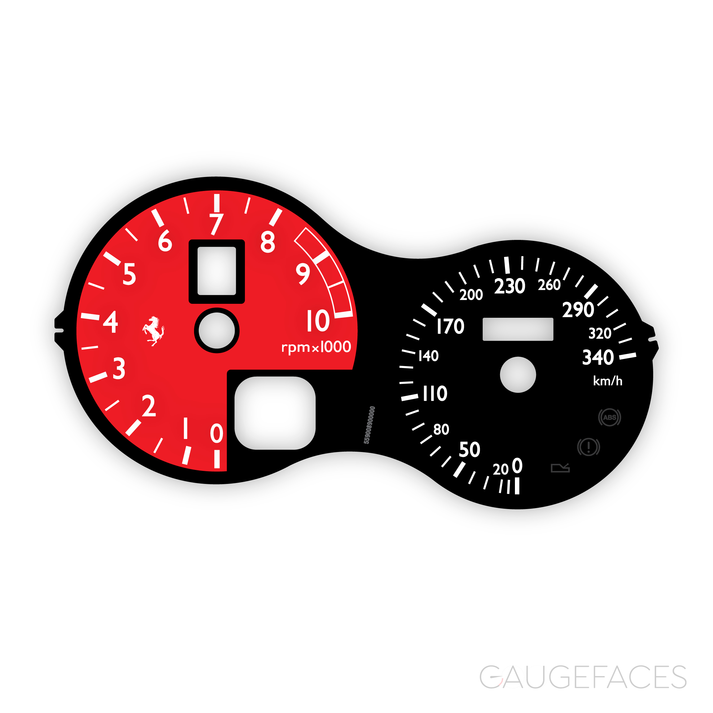 Ferrari F360 (Type F131, 1999-2005) / F430 (Type F131 EVO (F430 2004-2009) Dashboard Gauge Face – Stradale Look – OPTIONS – Black / Red.