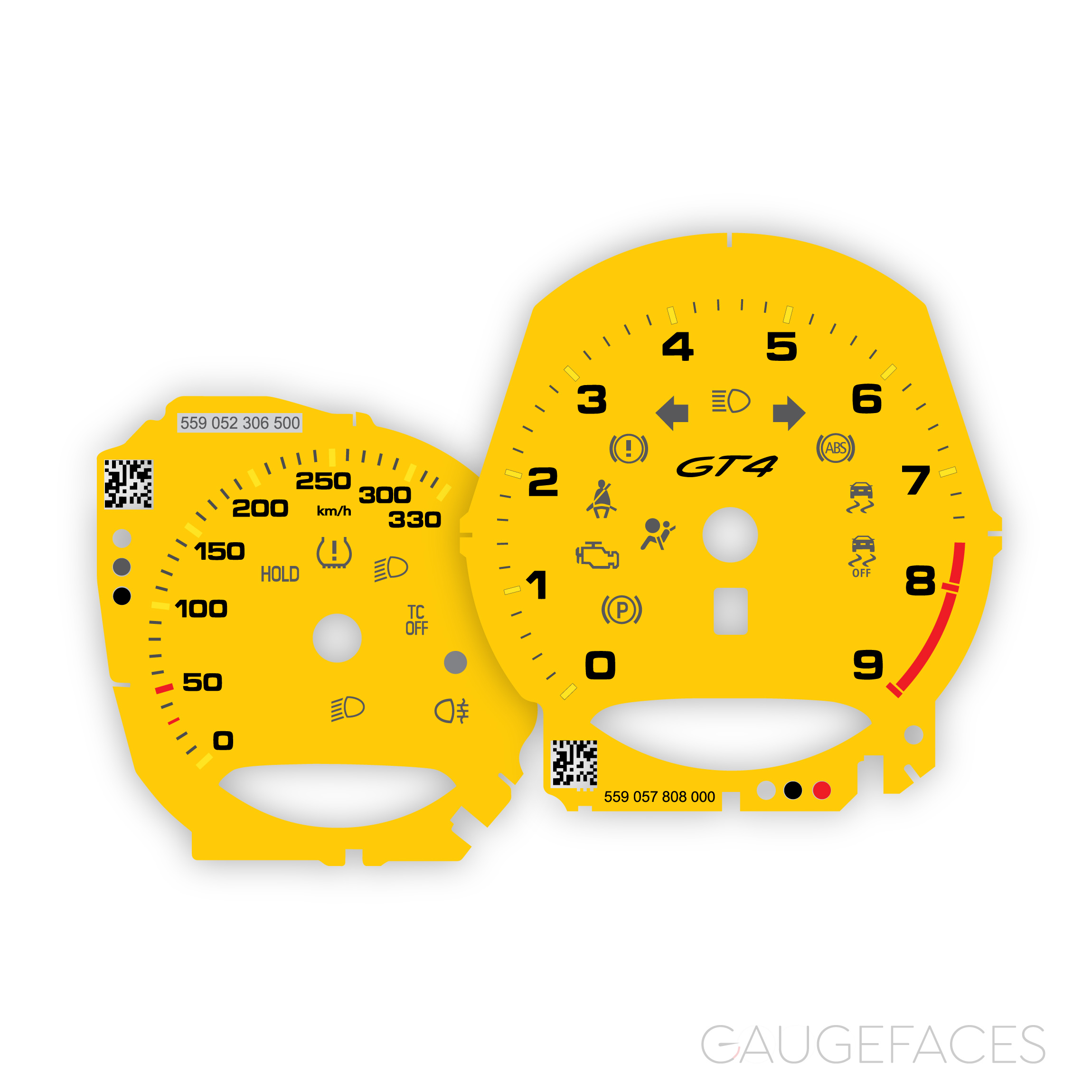 Gauge faces set for Porsche 718 / 981 Cayman GT4 – 9000 RPM – Speed Yellow.