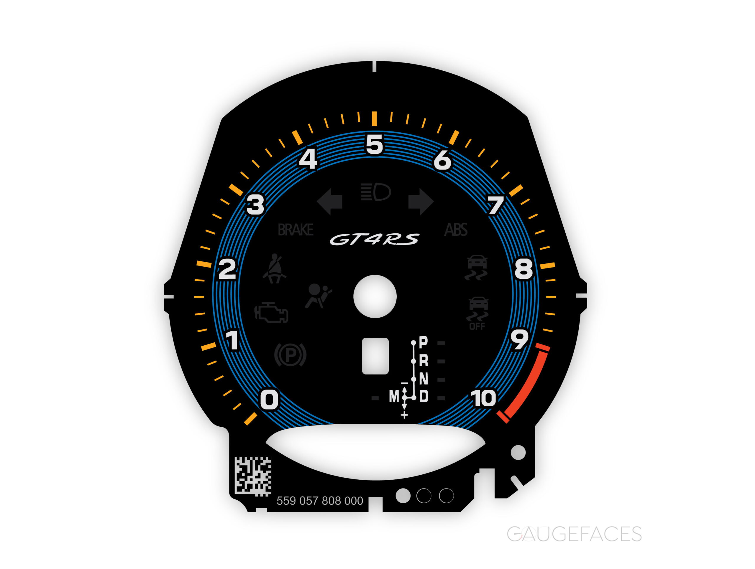 Gauge face tachometer for Porsche 718 Cayman GT4RS – 10000 RPM – PDK – Black with Dark Blue Fine Line Accent Track, 992-Style font.