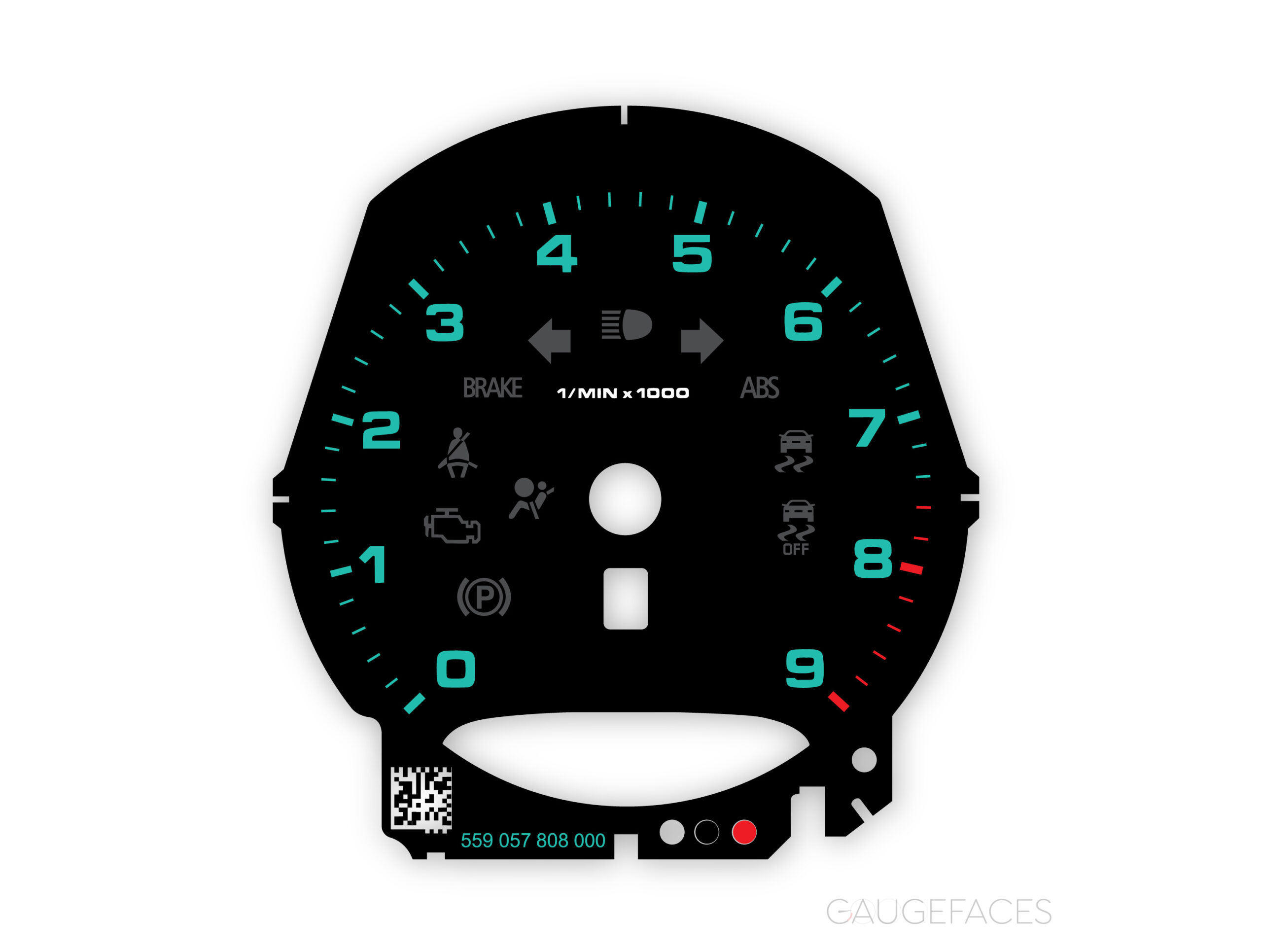 Gauge face tachometer for Porsche 911 991.1 / 981 Boxster/Cayman with the base (1/min x 1000) logo, 9000 RPM, PDK/manual transmission – Black with Blue numbers.