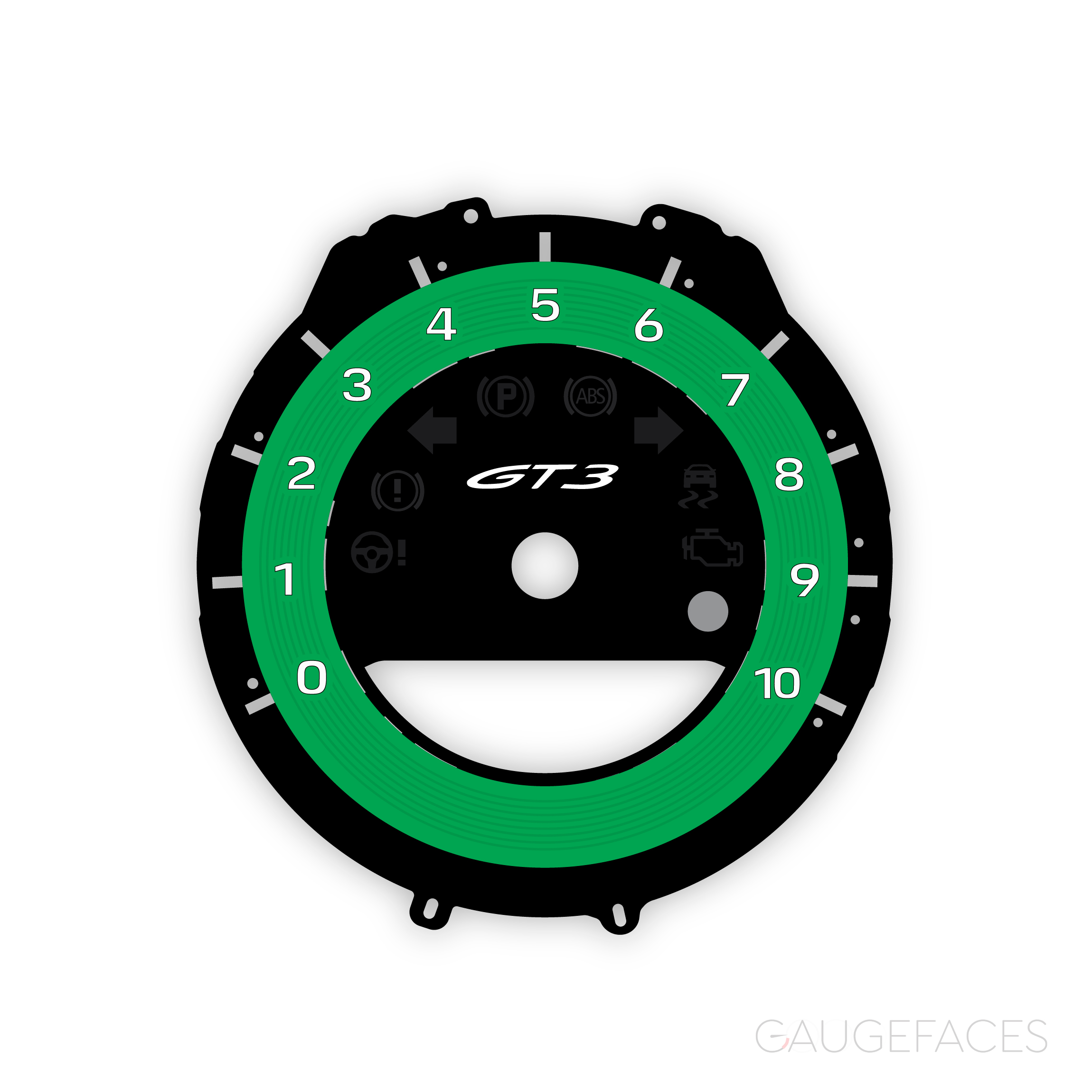 Gauge face tachometer (rev counter) for Porsche 911 992 – 10000 RPM, GT3 logotype – Black with Green Solid Accent Track.