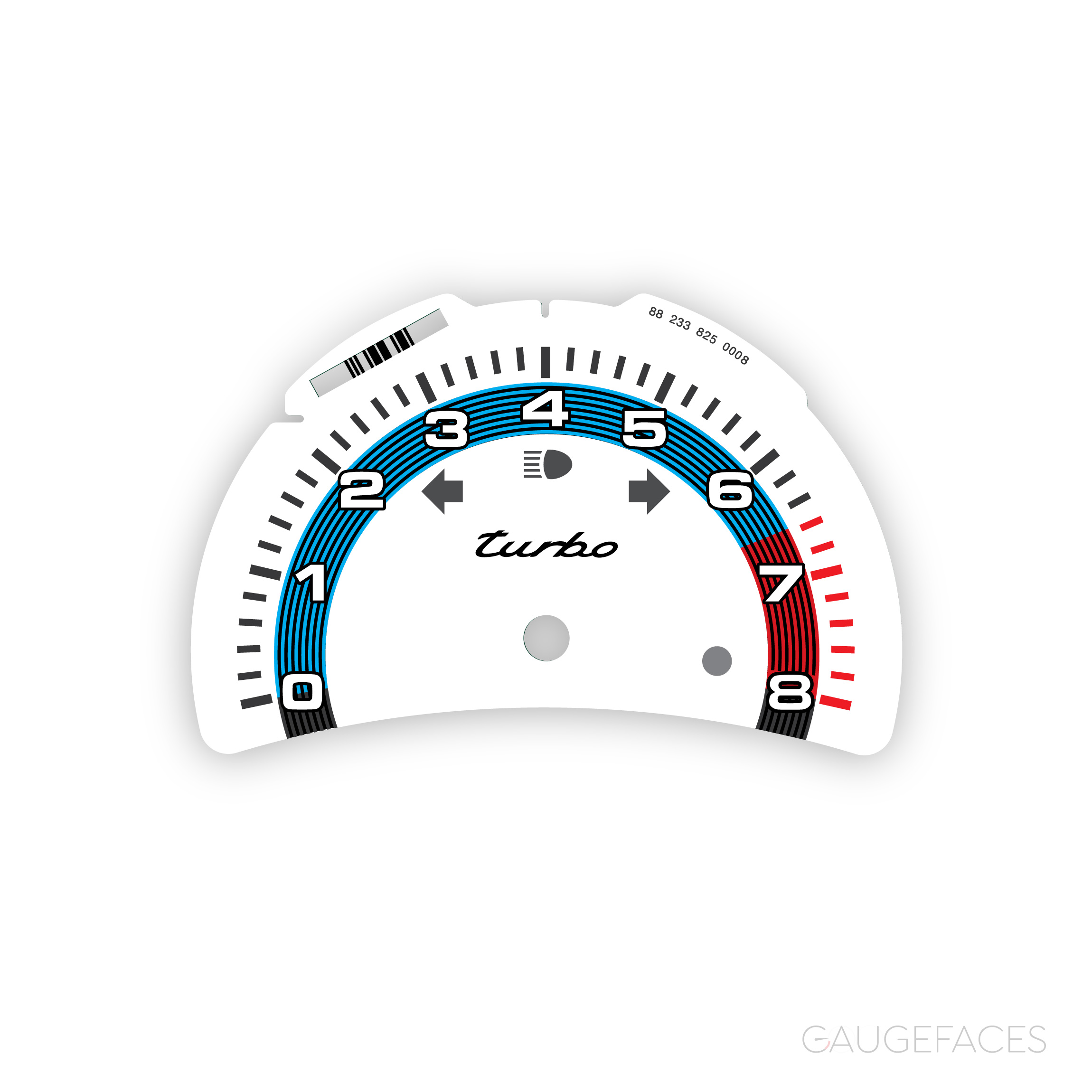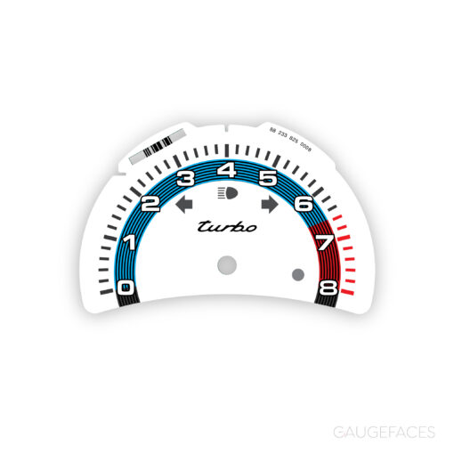 Instrument cluster gauge face tachometer for Porsche 911 996 Turbo – 8000 RPM – White with Shark Blue Solid Accent Ring.