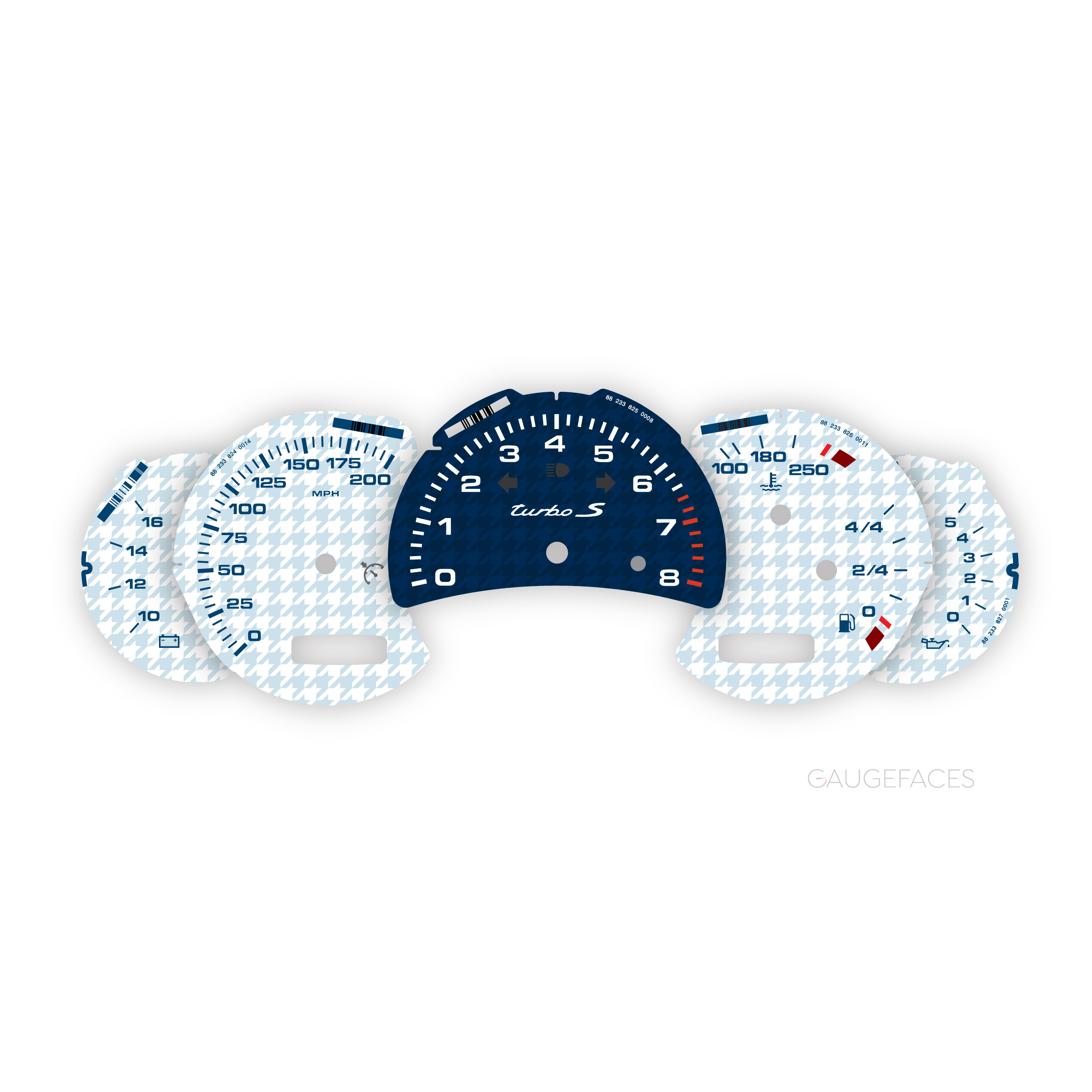 Instrument gauge faces set for Porsche 911 996 Turbo S – 8000 RPM – Houndstooth Pattern – White/Blue.