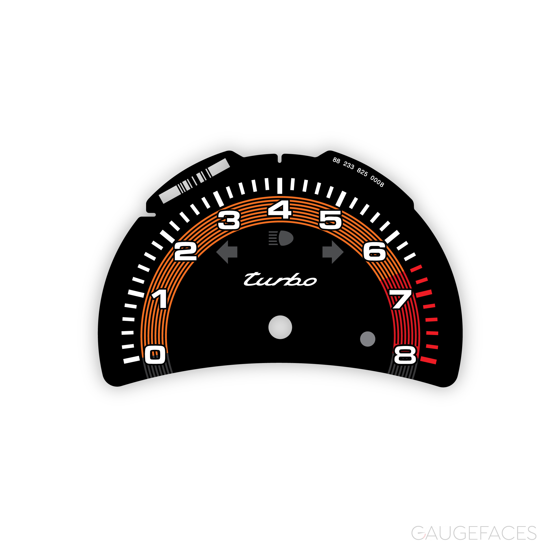 Instrument cluster gauge face tachometer for Porsche 911 996 Turbo / Turbo S – 8000 RPM – Black with Orange Fine Line Accent Track.