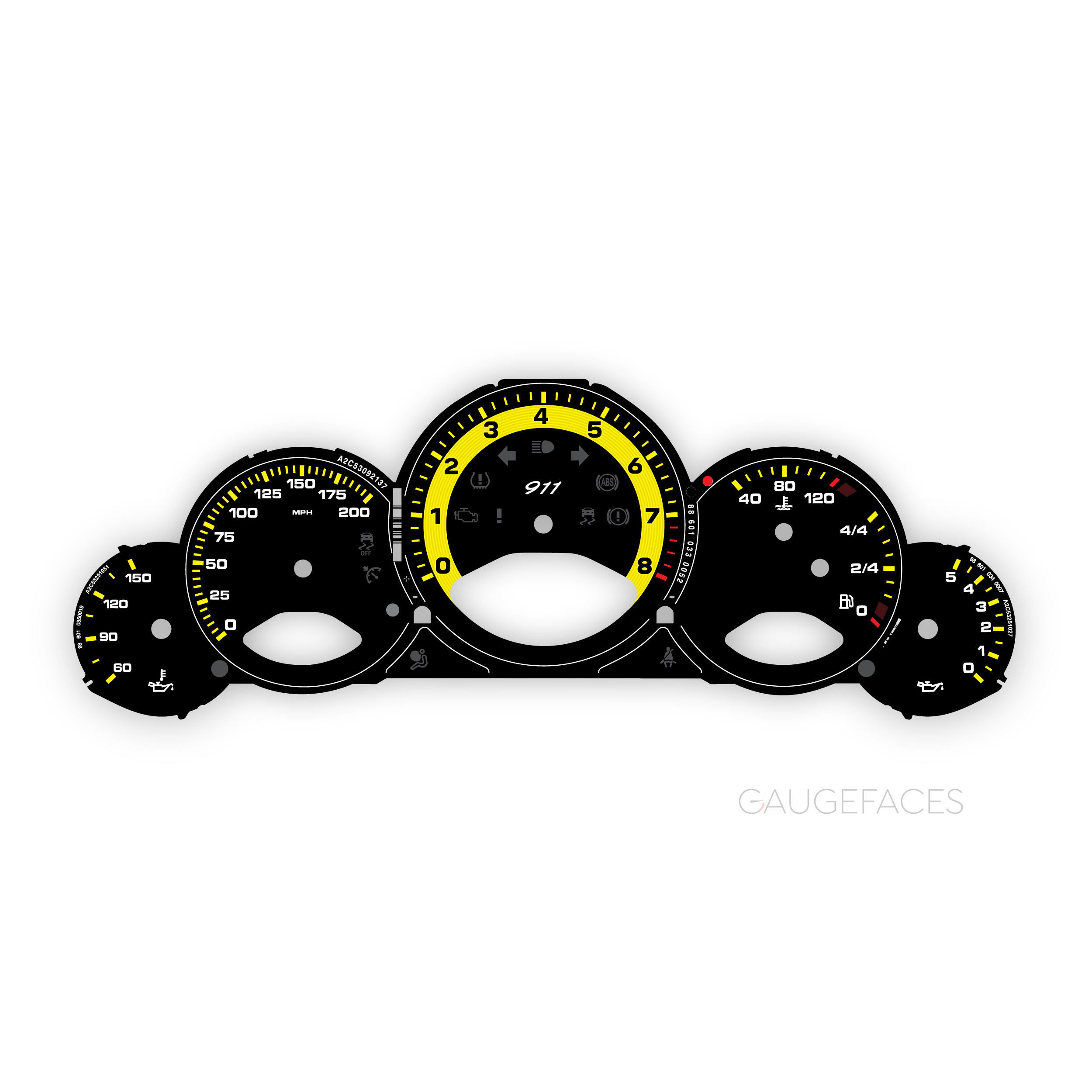 For Porsche 911 997.1: Gauge Faces Set – 911 Logo – UK-Spec – Manual – Black / Yellow Solid Accent Track