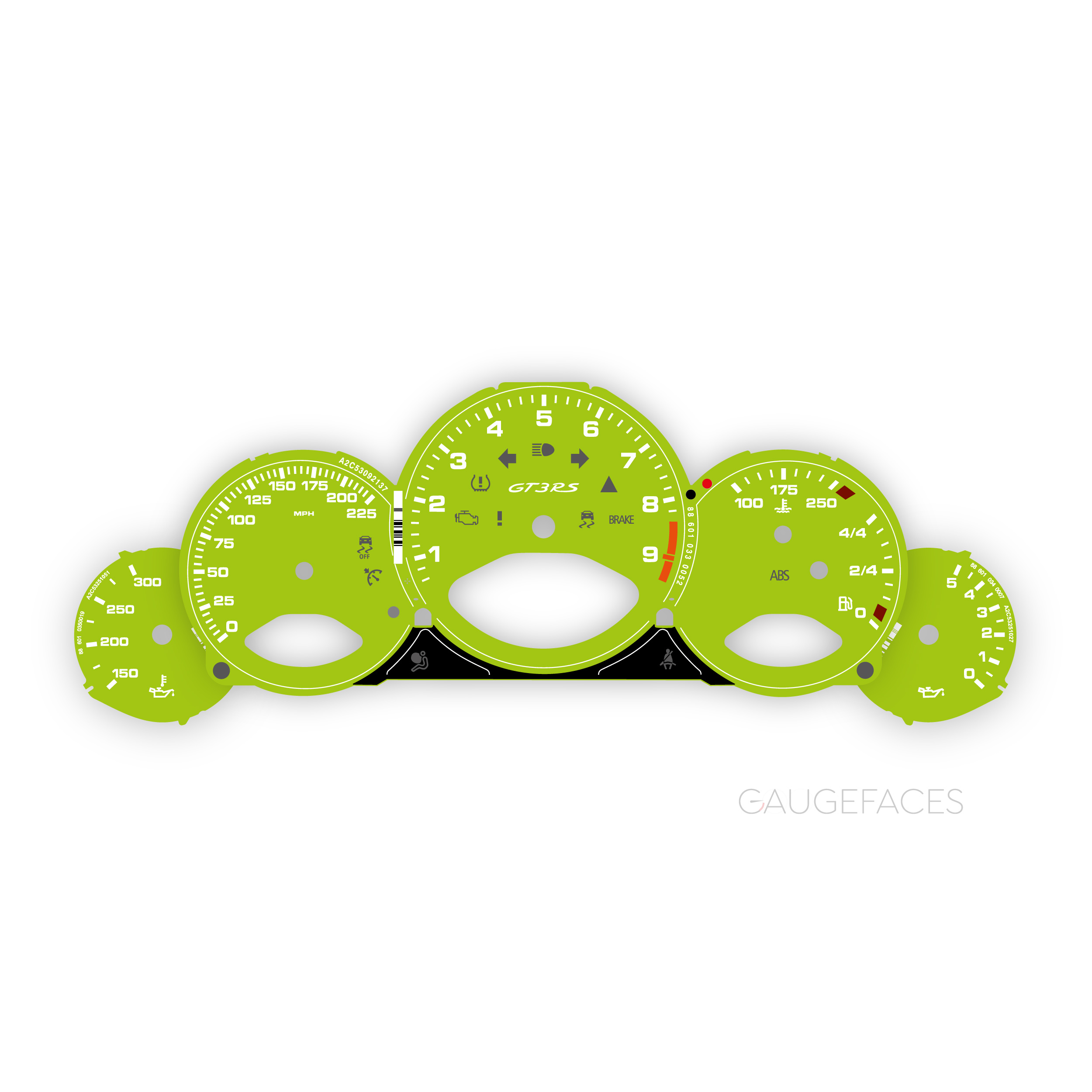Porsche 911 997 (Gen 1&2) GT3 / GT3 RS / RS 4.0 gauge faces set – 9000 RPM, manual transmission – Acid Green.
