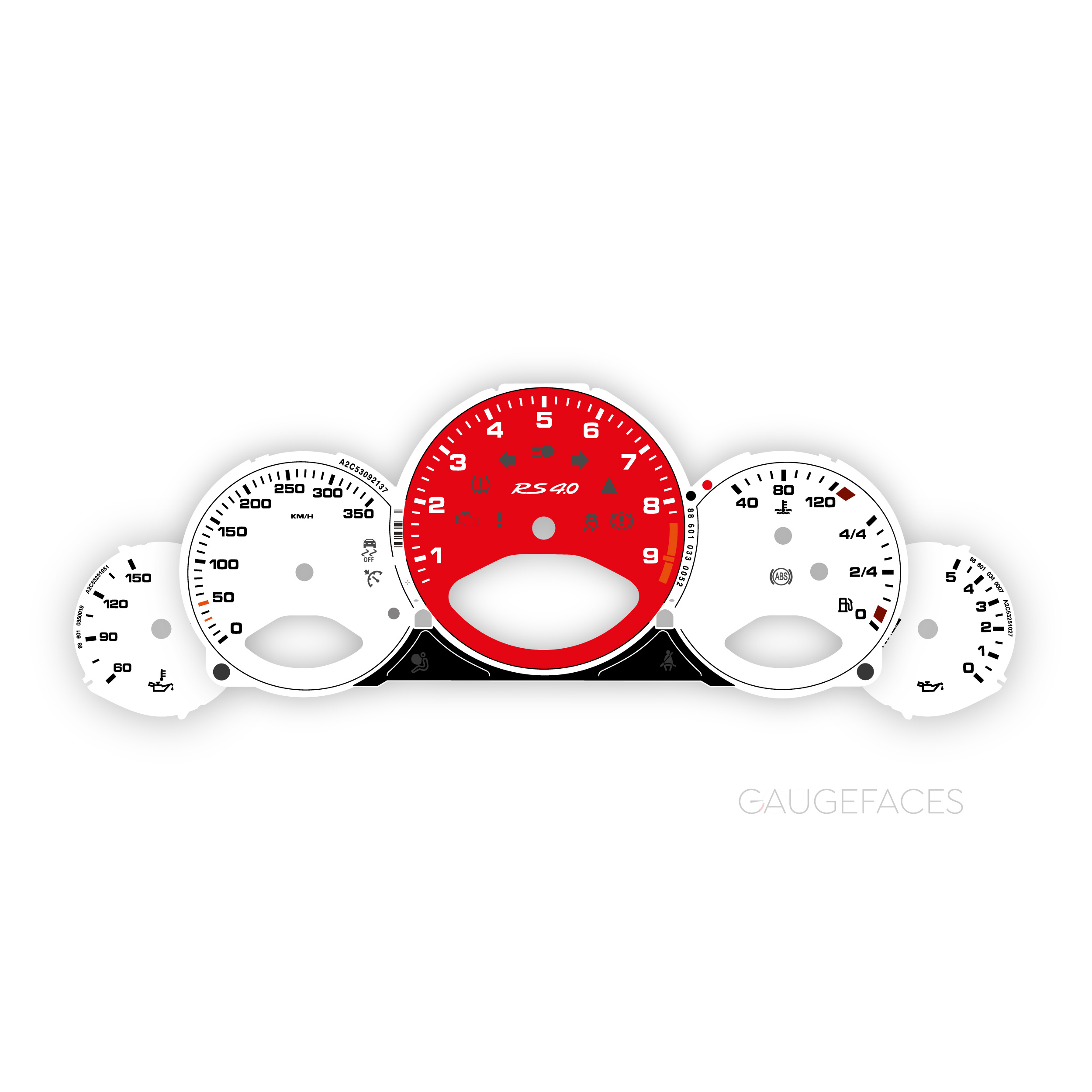Porsche 911 997 (Gen 1&2) GT3 / GT3 RS / RS 4.0 gauge faces set – 9000 RPM, manual transmission – White with Red Tachometer.