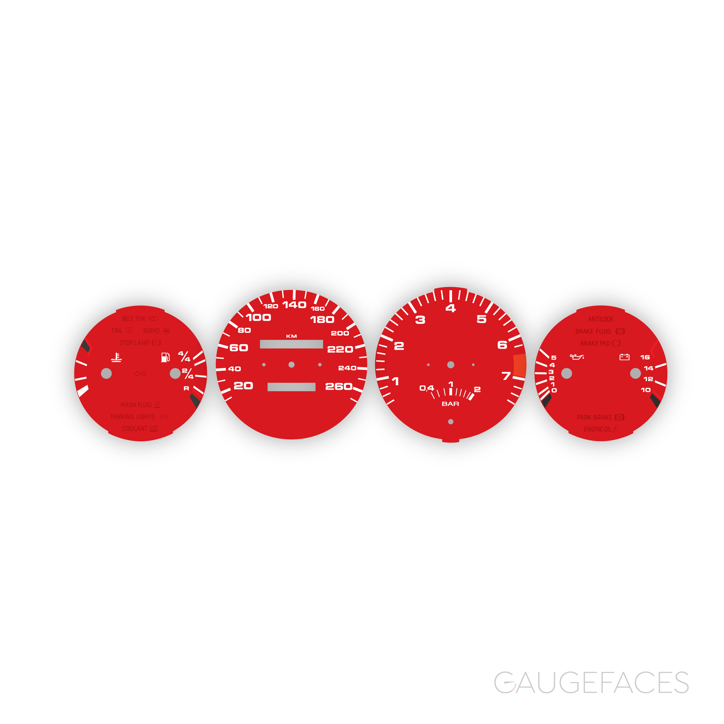 Instrument cluster gauge faces for Porsche 944 Turbo (1985-88) with 160 mph / 260 km/h speed range – manual transmission – Red.