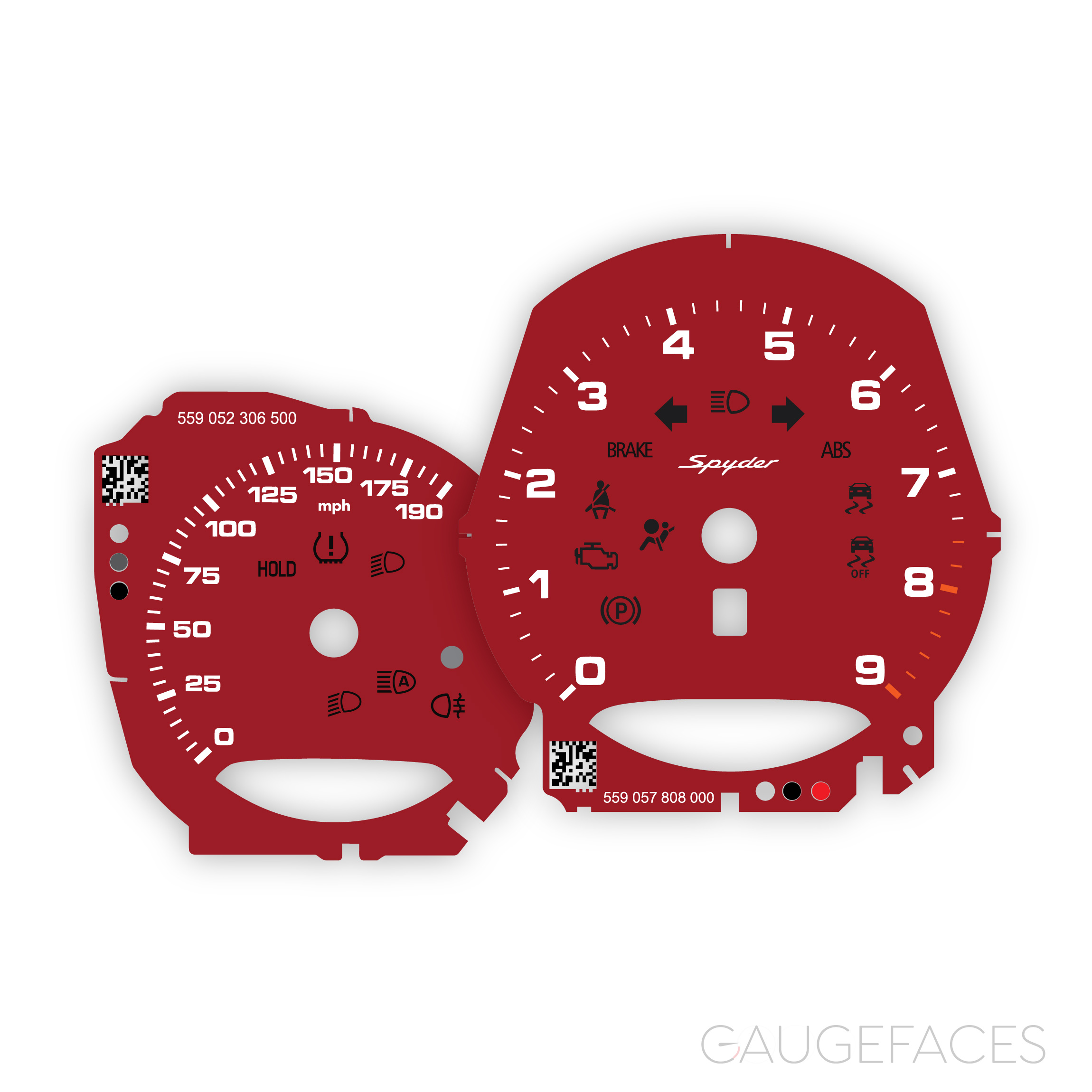 Porsche 981/ 718 Boxster Spyder gauge face tachometer/set with Spyder logo, for 9000 RPM, PDK/manual (select from the drop-down list) – Carmine Red.