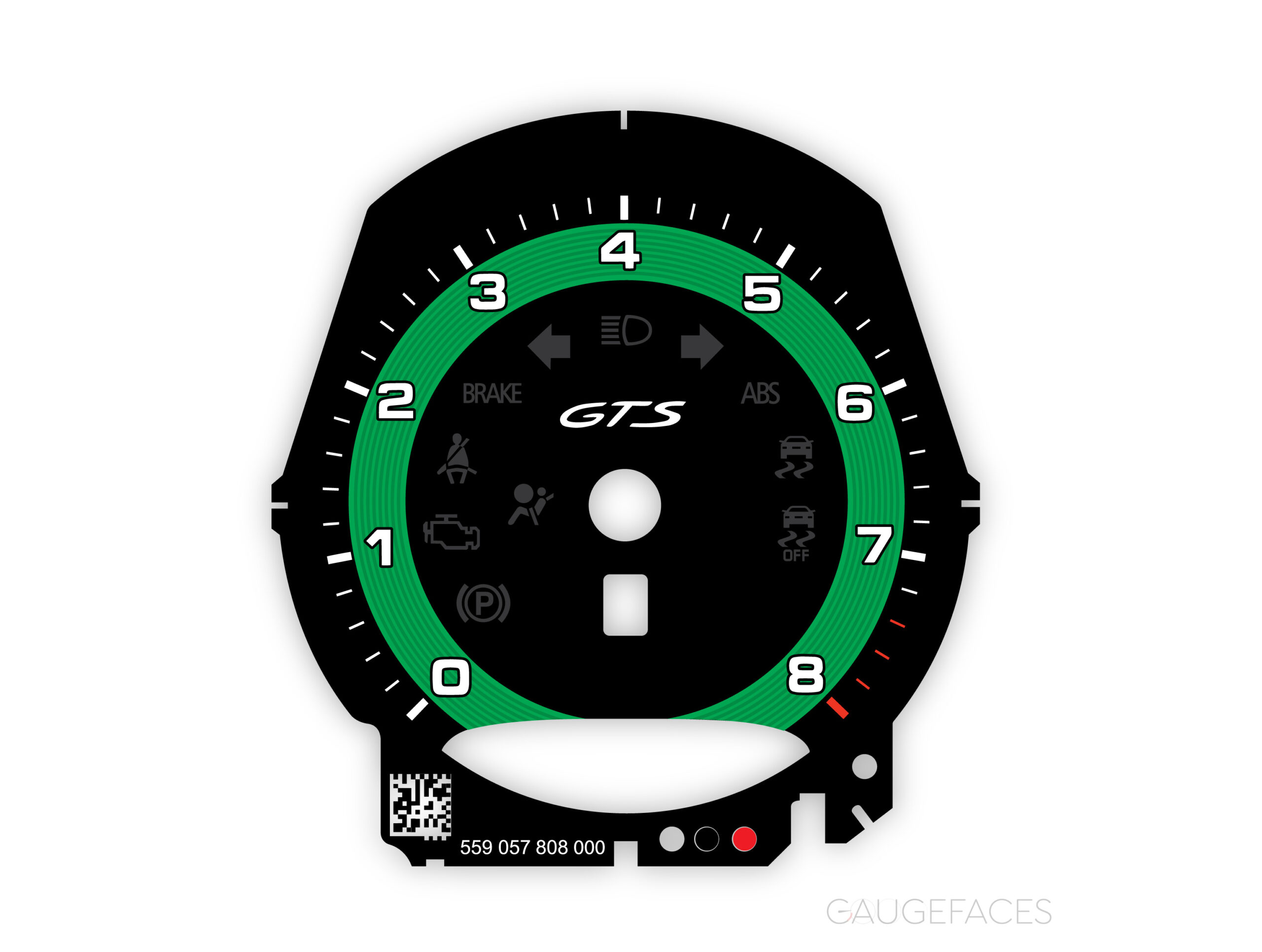 Gauge face tachometer for Porsche 911 (991.2) GTS, Boxster/Cayman 718 GTS 2.5L – Black with Python Green Solid Accent Track.