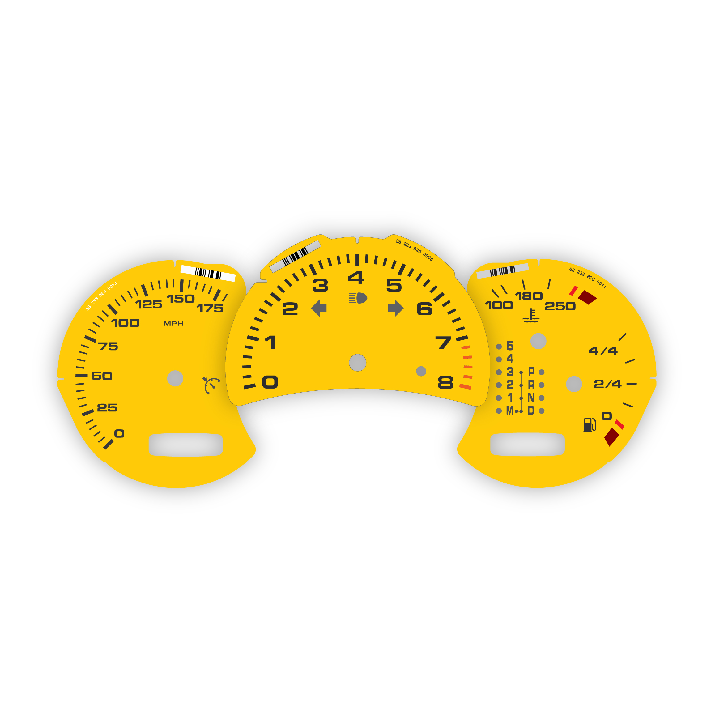 Instrument gauge faces set Porsche Boxster 986 (Gen 1&2) – 8000 RPM – Manual/Tiptronic – Speed Yellow (911 Blockstyle font).