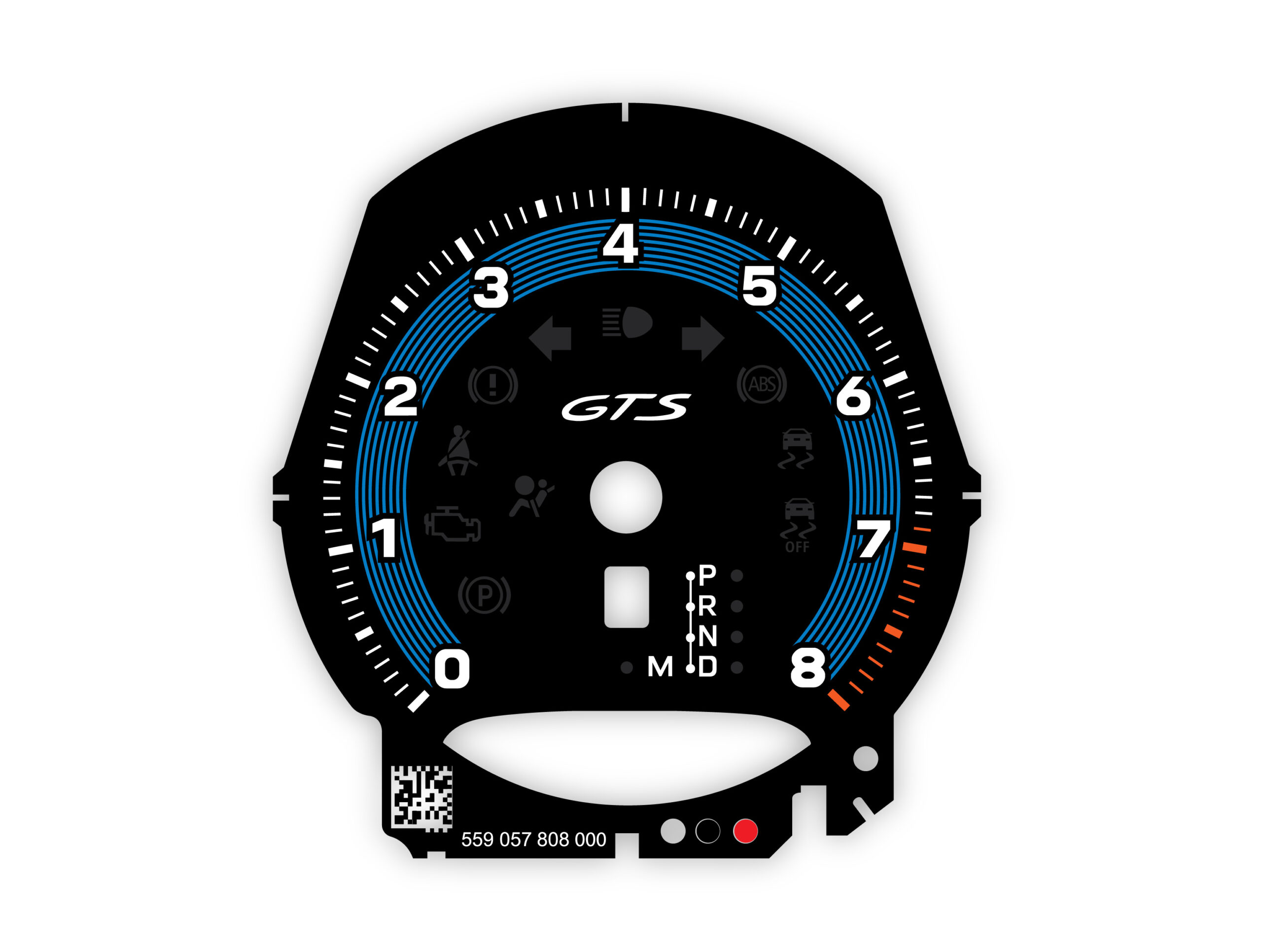 Gauge Face tachometer for Porsche Macan GTS – 8000 RPM, PDK transmission – Black with Orange Fine Line Accent Track.