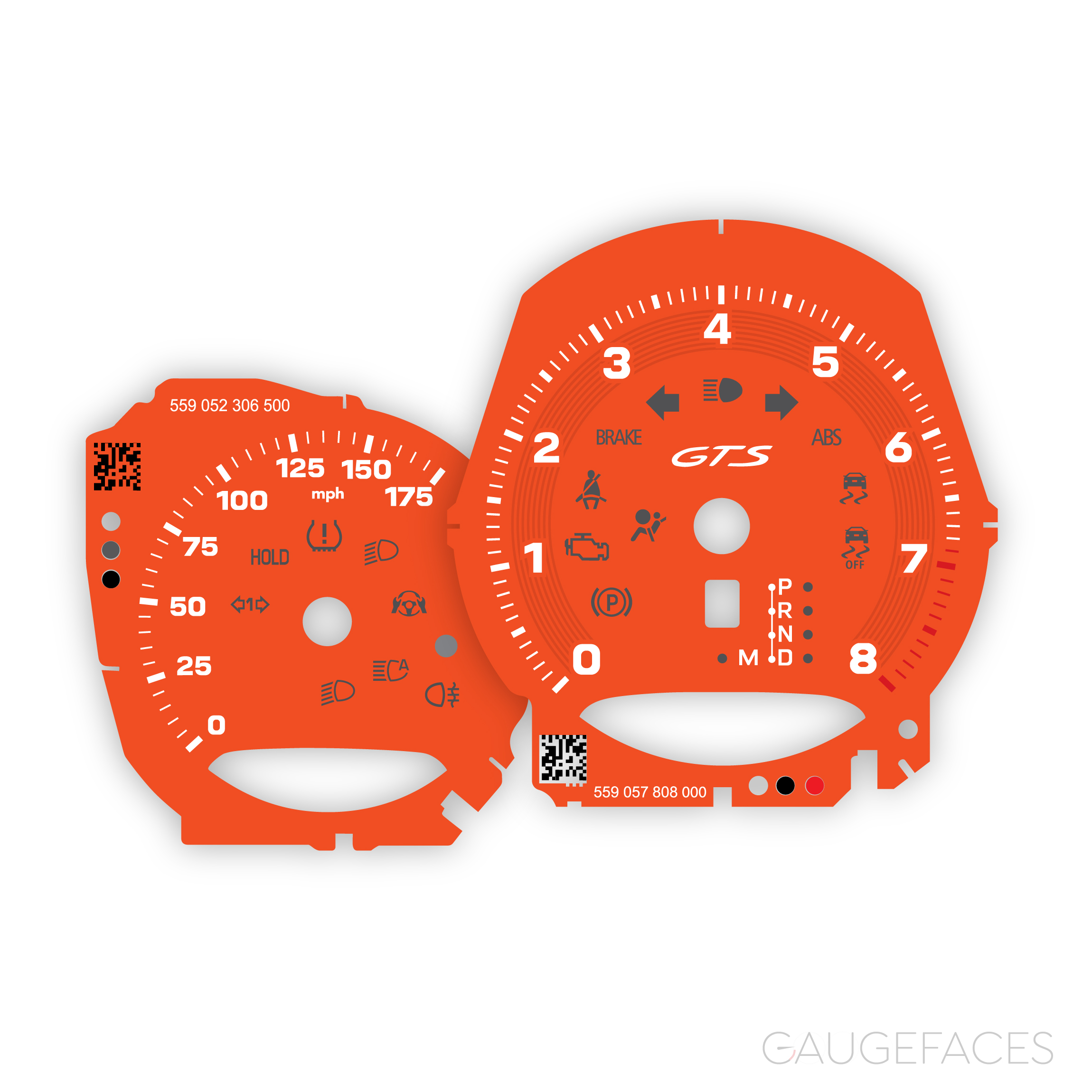 Gauge faces set for Porsche Macan GTS (2021-) – OPTIONS – 8000 RPM, PDK (automatic) transmission – Papaya Orange.