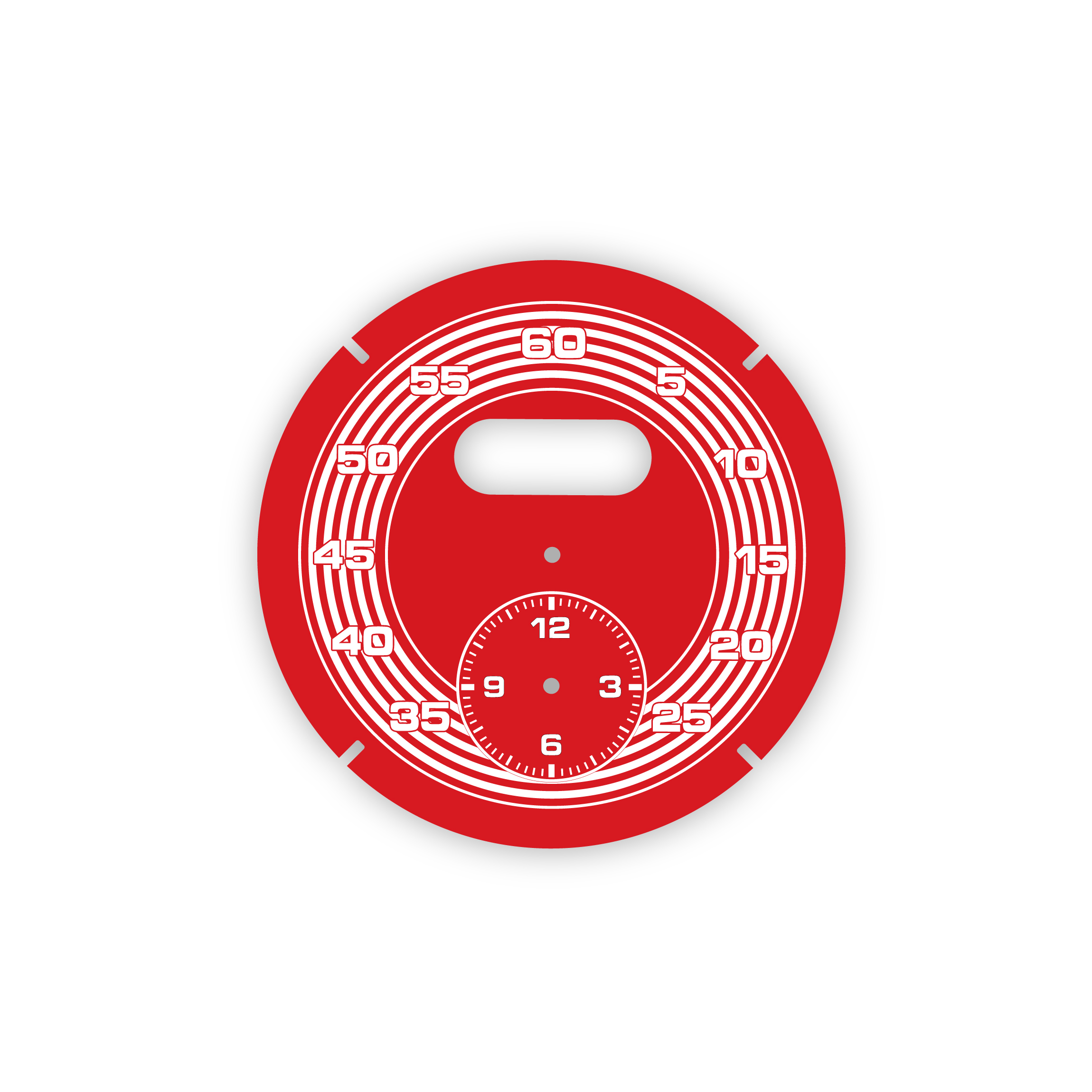 Sport chrono gauge face for Porsche – Guards Red with White Fine-Line Accent Ring, White numbers.