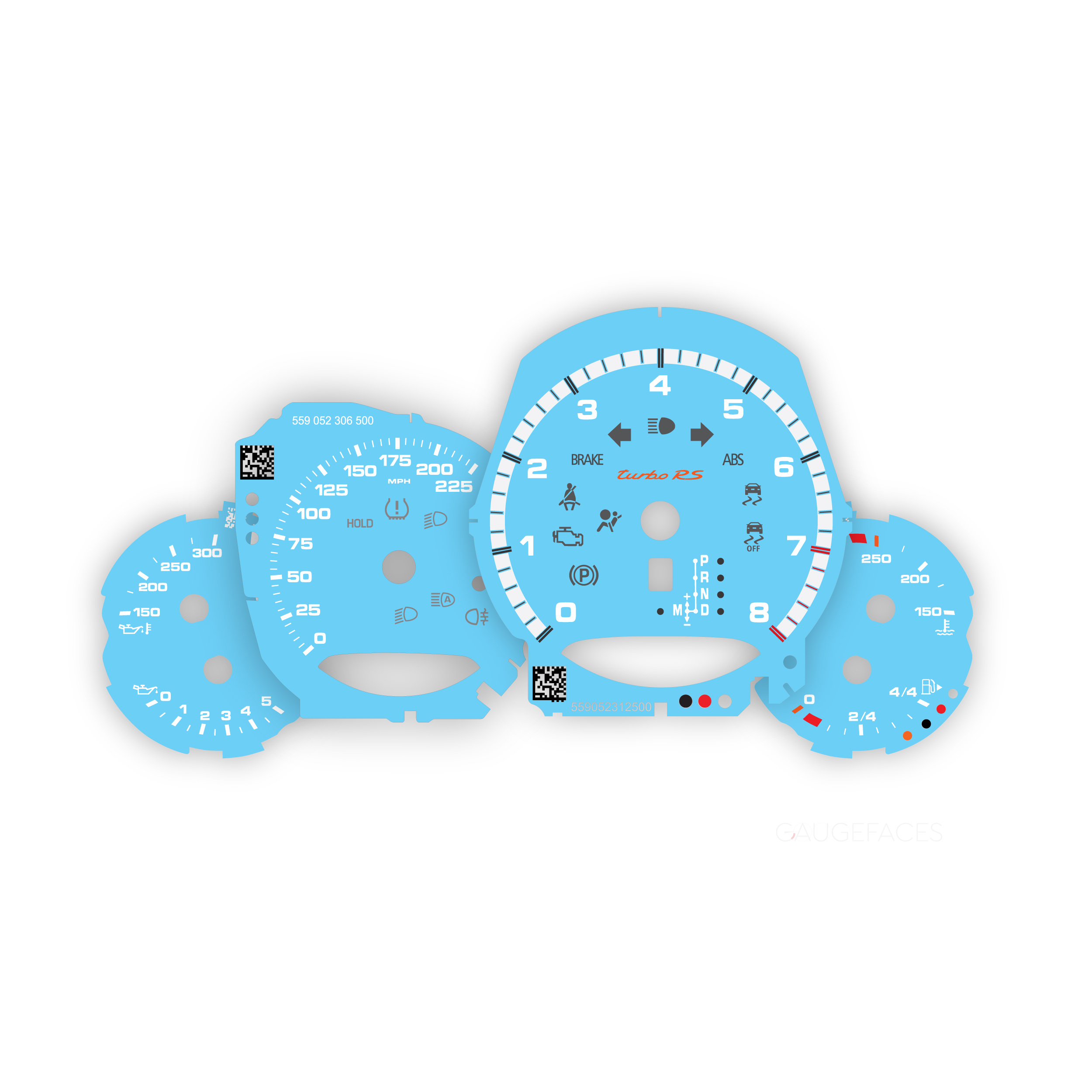 Custom gauge faces set for Porsche 911 991.1 Turbo / Turbo S – US-spec (mph, Celsius) – 8000 RPM – Light Blue.