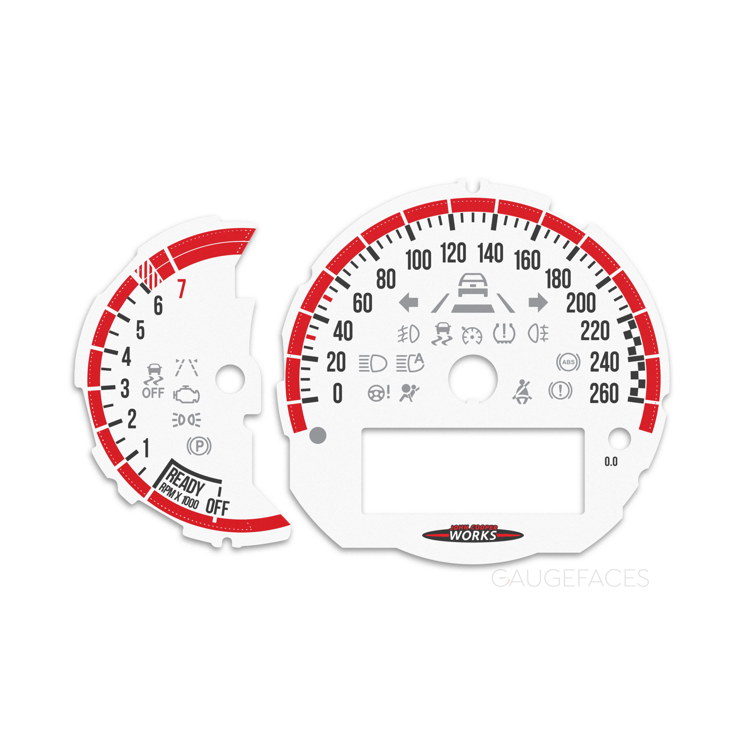 Instrument cluster gauge faces for Mini Copper F54 / F55 / F56 / F57 / F60 – White with Red Accent tracks – John Cooper Works logotype.