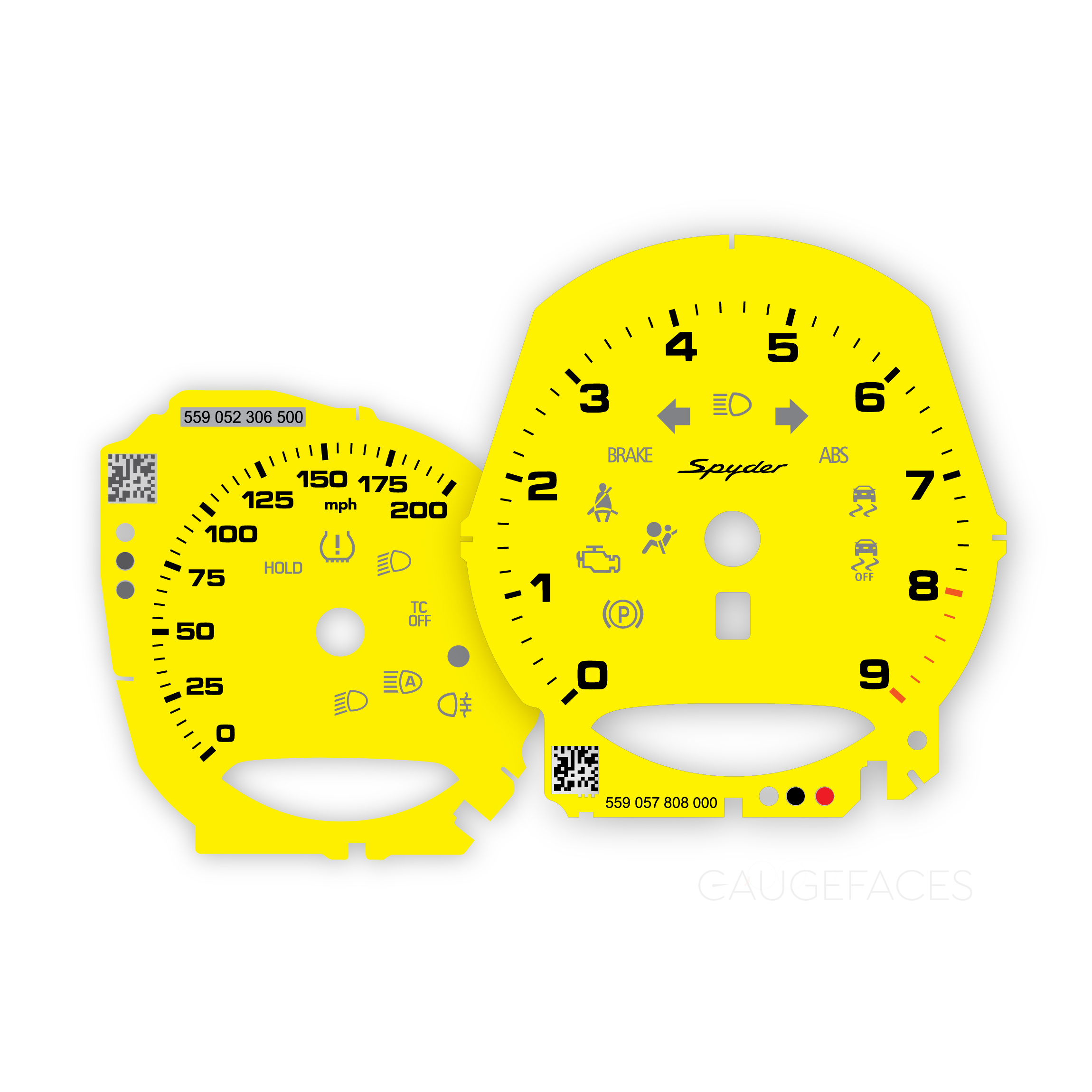 Porsche 718 / 981 Boxster Spyder gauge face tachometer with Spyder logo, for 9000 RPM, PDK/manual (select from the drop-down list) – Racing Yellow.