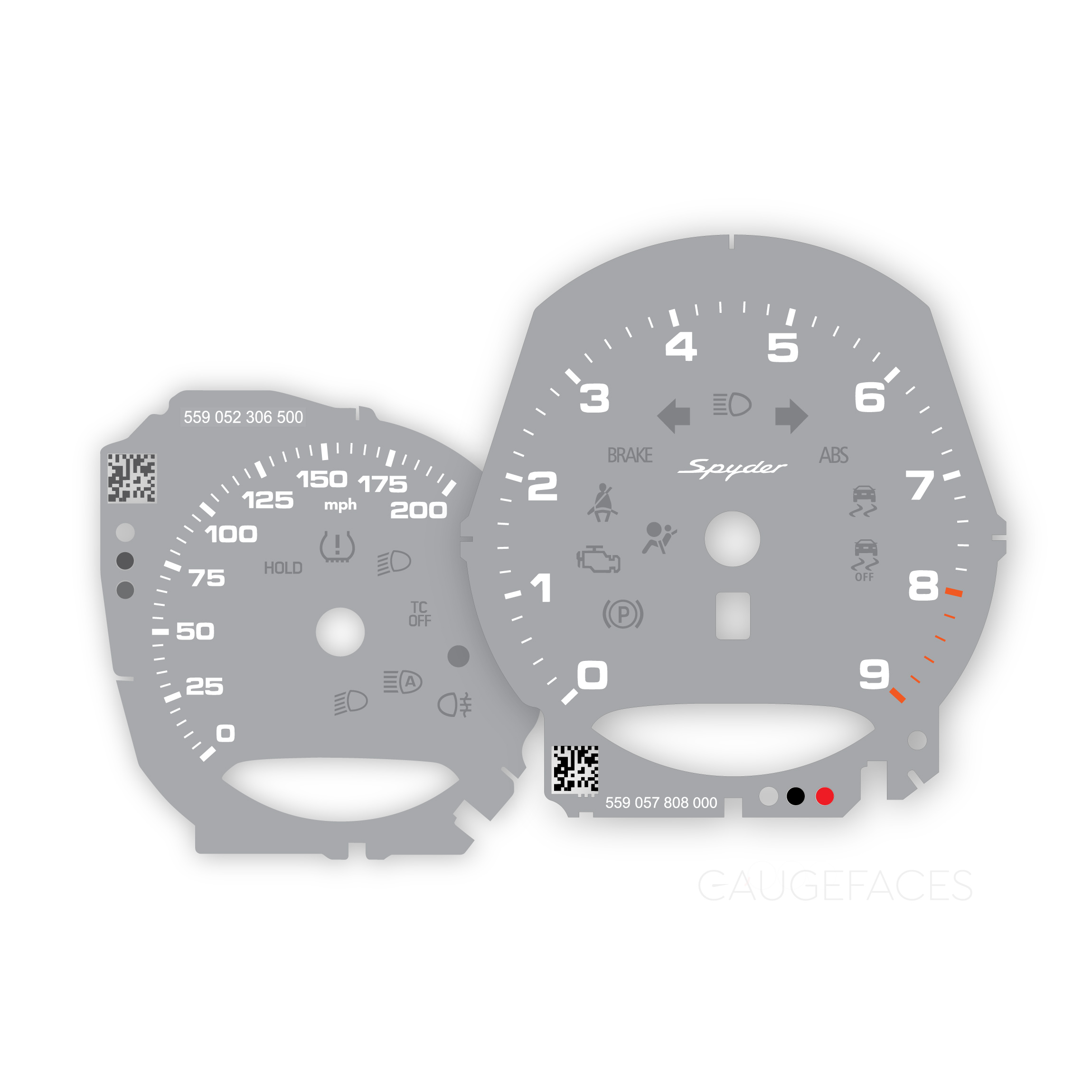 Porsche 718 / 981 Boxster Spyder gauge face tachometer with Spyder logo, for 9000 RPM, PDK/manual (select from the drop-down list) – Arctic Gray.