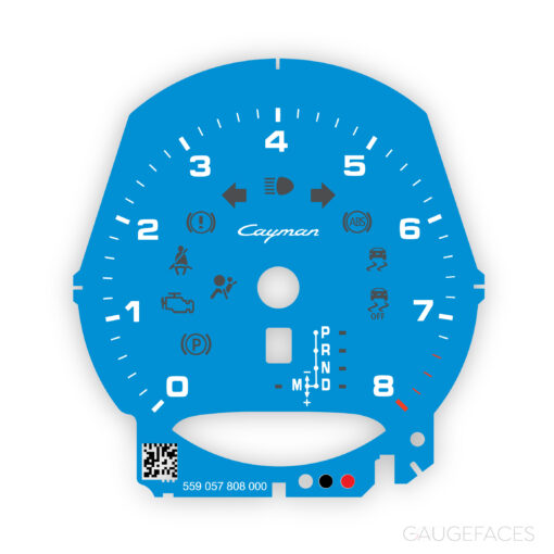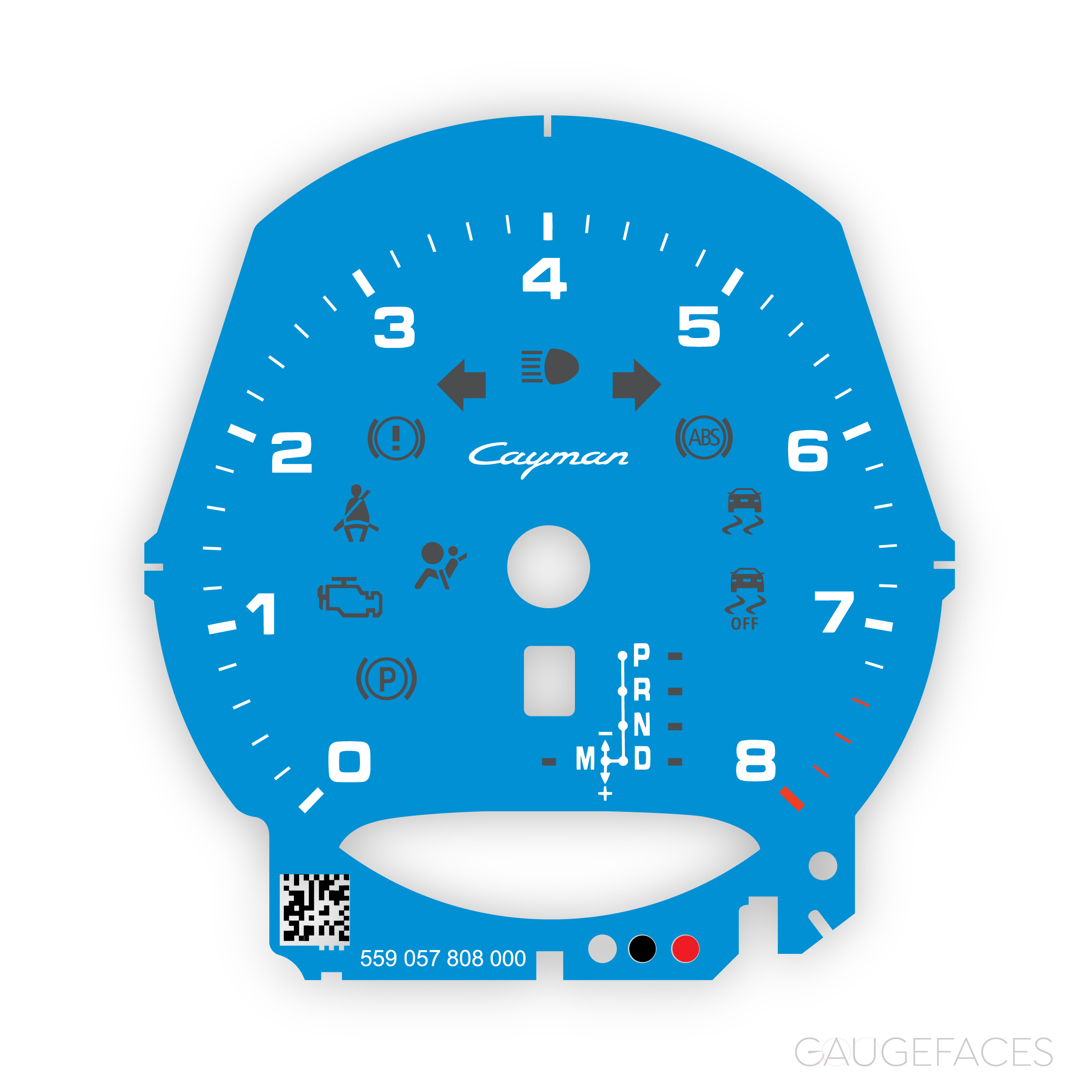 Gauge face tachometer for Porsche 718 Cayman – Cayman logotype – 8000 RPM, PDK/manual transmission – Heritage Design Edition – Miami Blue.