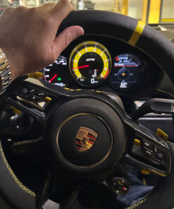 Gauge face tachometer for Porsche 718 Cayman GT4 – 9000 RPM – PDK/Manual transmission (select from the drop-down list) – Black with Racing Yellow Solid Accent Track (992 Style font).