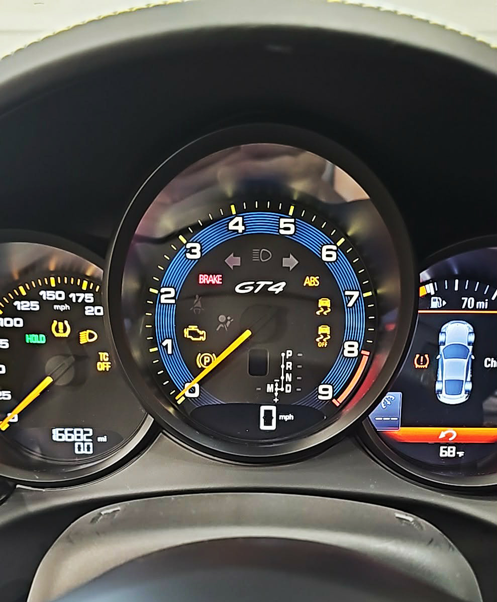 Gauge face tachometer for Porsche 718 Cayman GT4 with 9000 RPM, PDK transmission – Black with Dark Blue Fine Line Accent Track.