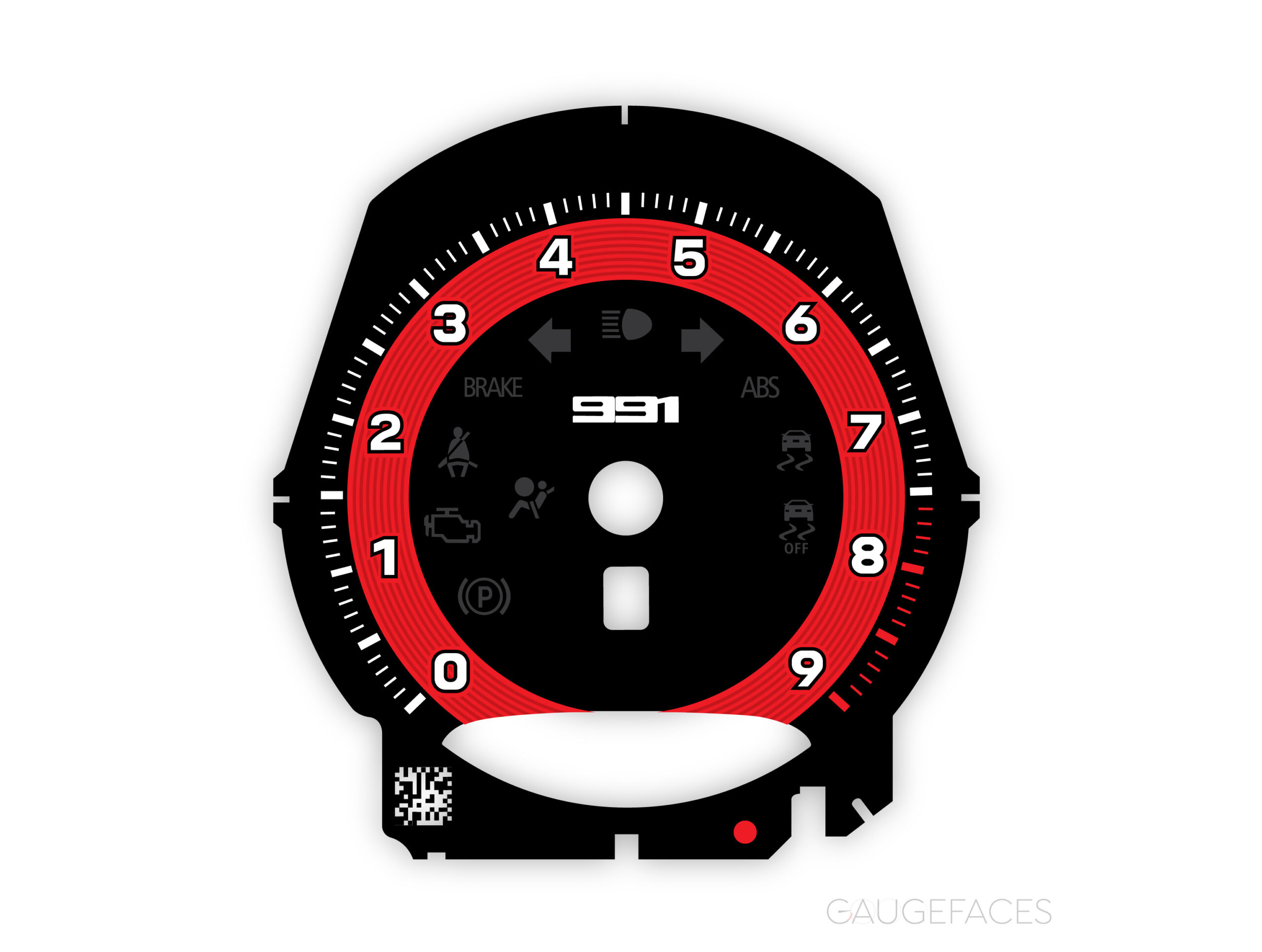 Porsche 911 991.1 gauge face tachometer with 911 logo, for 9000 RPM, manual transmission – Black with Guards Red Solid Accent Track.