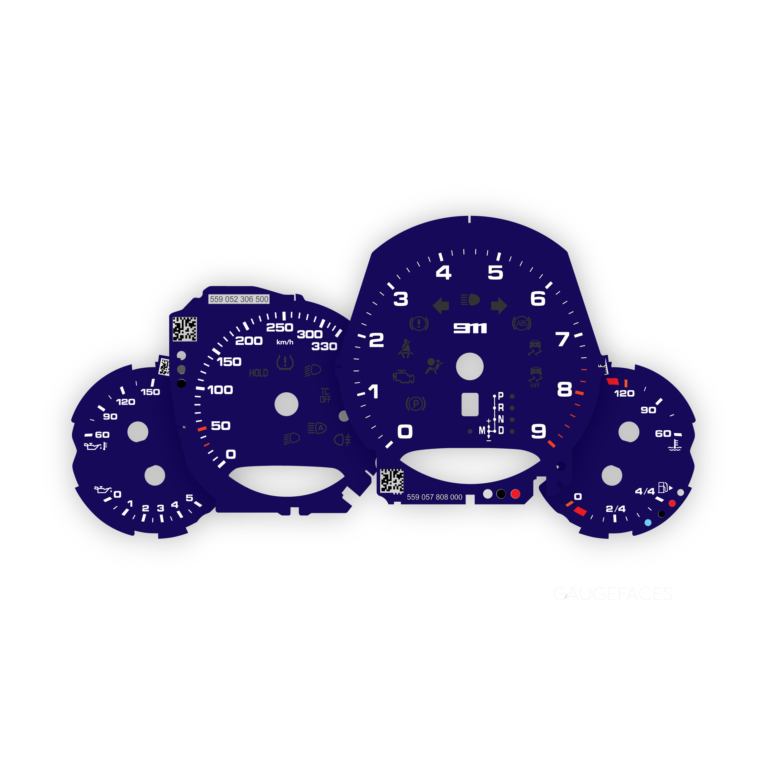 Instrument cluster gauge faces set for Porsche 911 991.1 with 911 logotype – PDK transmission – Deep Blue.