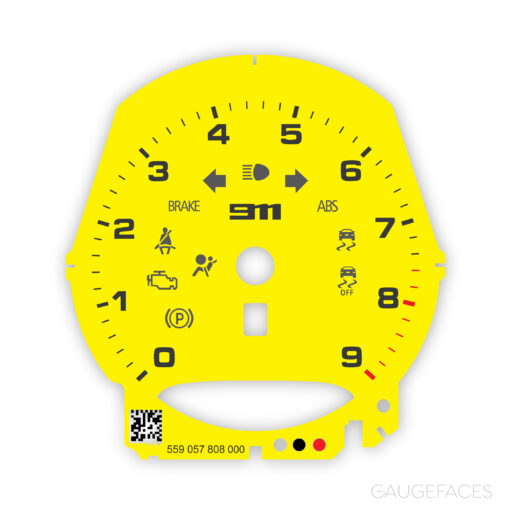 Gauge face tachometer for Porsche 911 991.1 – 911 Logotype – 9000 RPM, PDK Transmission – Racing Yellow.
