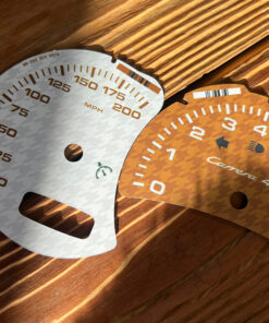 Instrument gauge faces set for Porsche 911 996.2 – Carrera 4S logotype – US-Spec – Manual – 8000 RPM – White/Bronze Houndstooth Pattern.