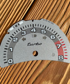 Instrument cluster gauge face tachometer for Porsche 911 996 Turbo – 8000 RPM – Light Gray Metallic with Gray Fine Line Accent Track.