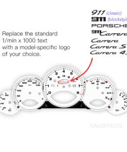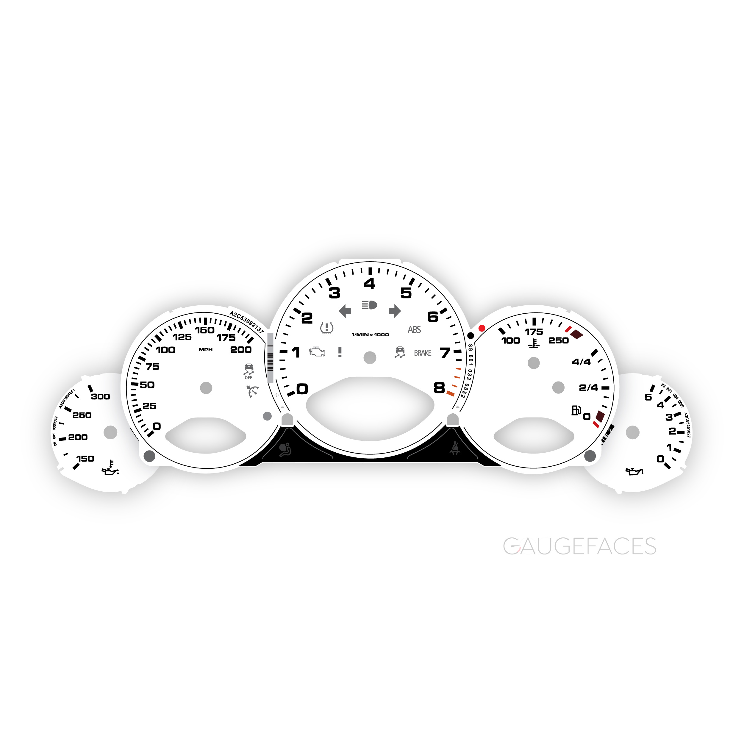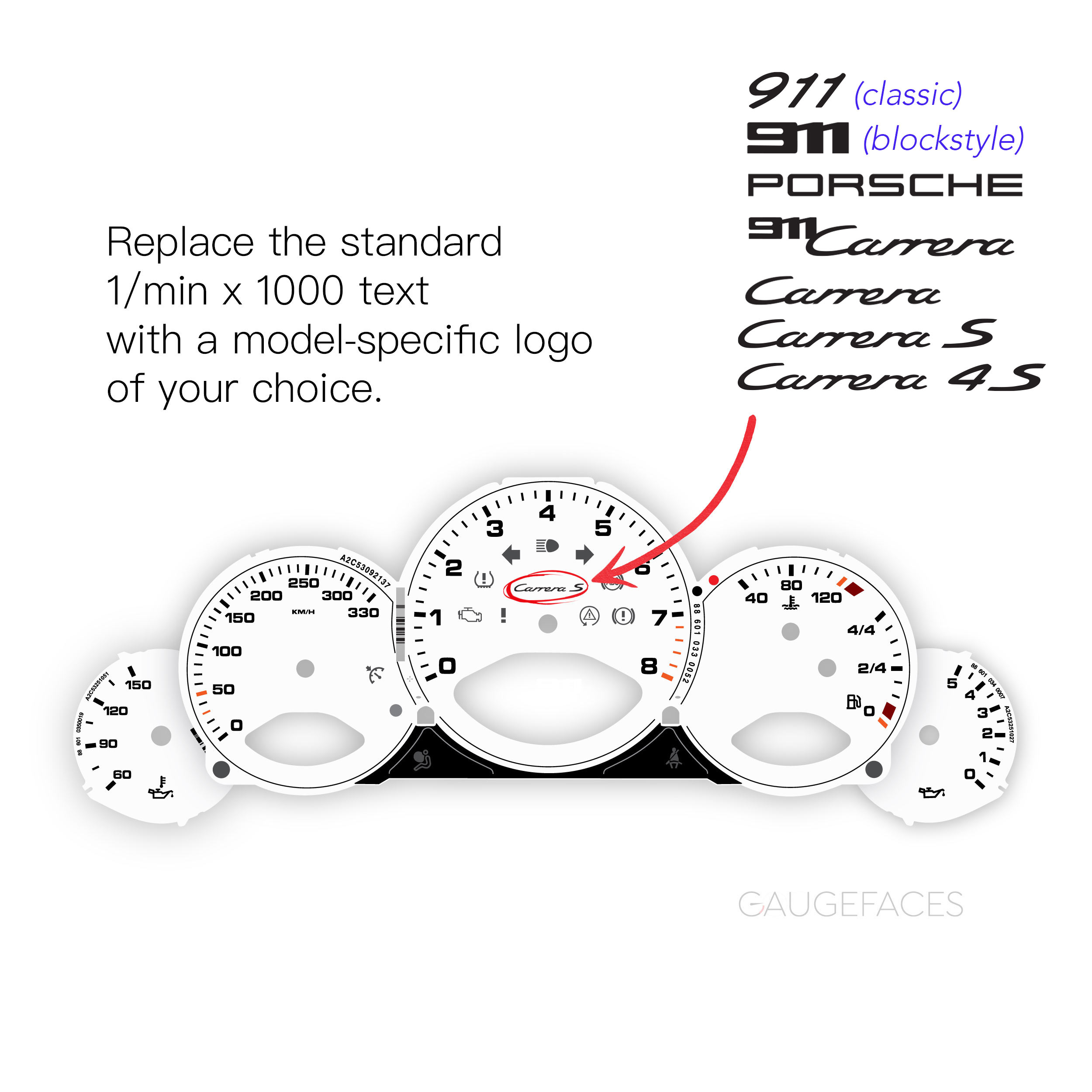 Porsche 911 997 Carrera gauge faces set with Base (1/min x 1000) logotype, 8000 RPM, PDK/Tiptronic/manual transmission, Celsius/Fahrenheit, US/EU/UK-spec, White. To choose the necessary combination, please select the desired options from the drop-down list.