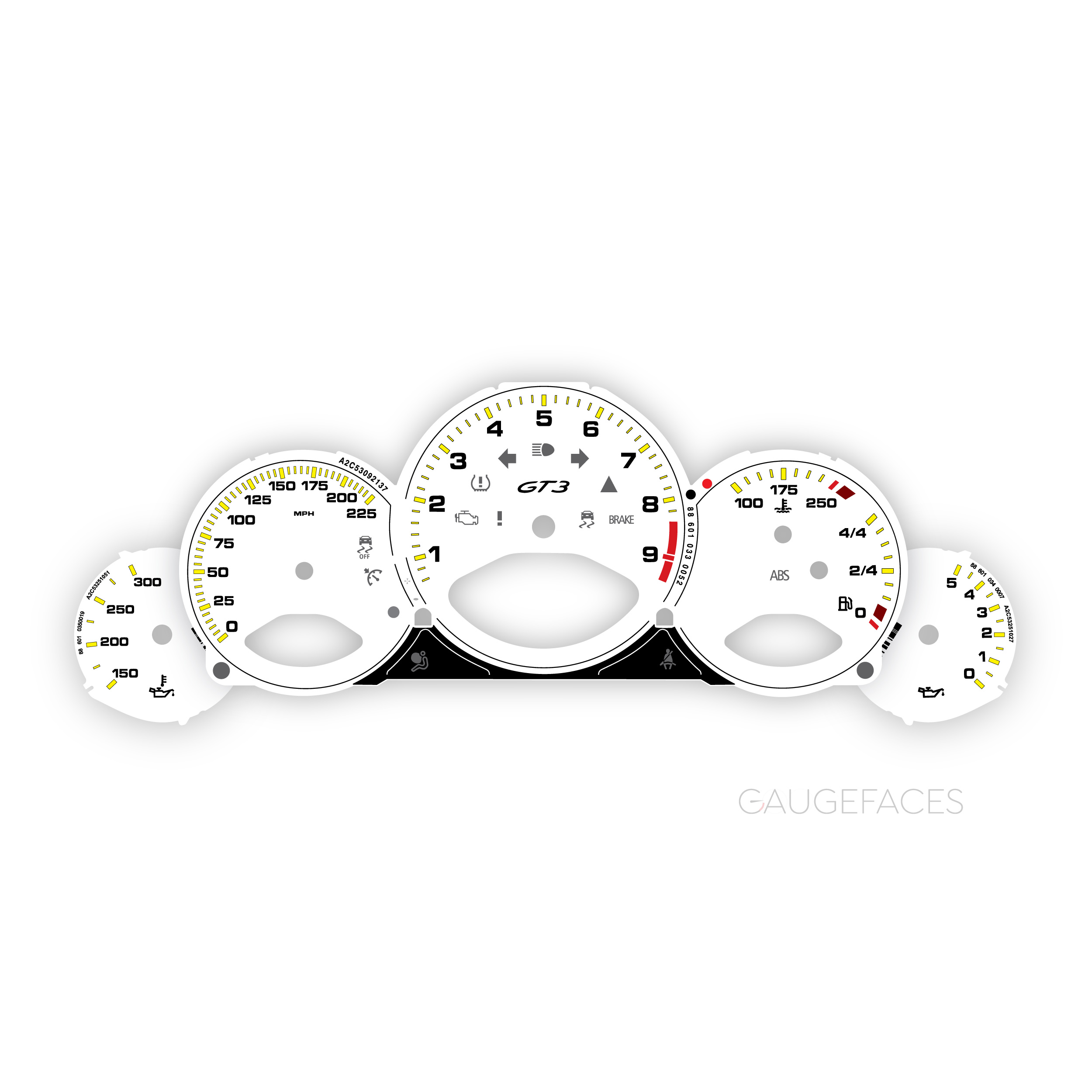 Porsche 911 997 (Gen 1&2) GT3 / GT3 RS gauge faces set with GT3 logotype, 9000 RPM, manual transmission – White with yellow dashes.