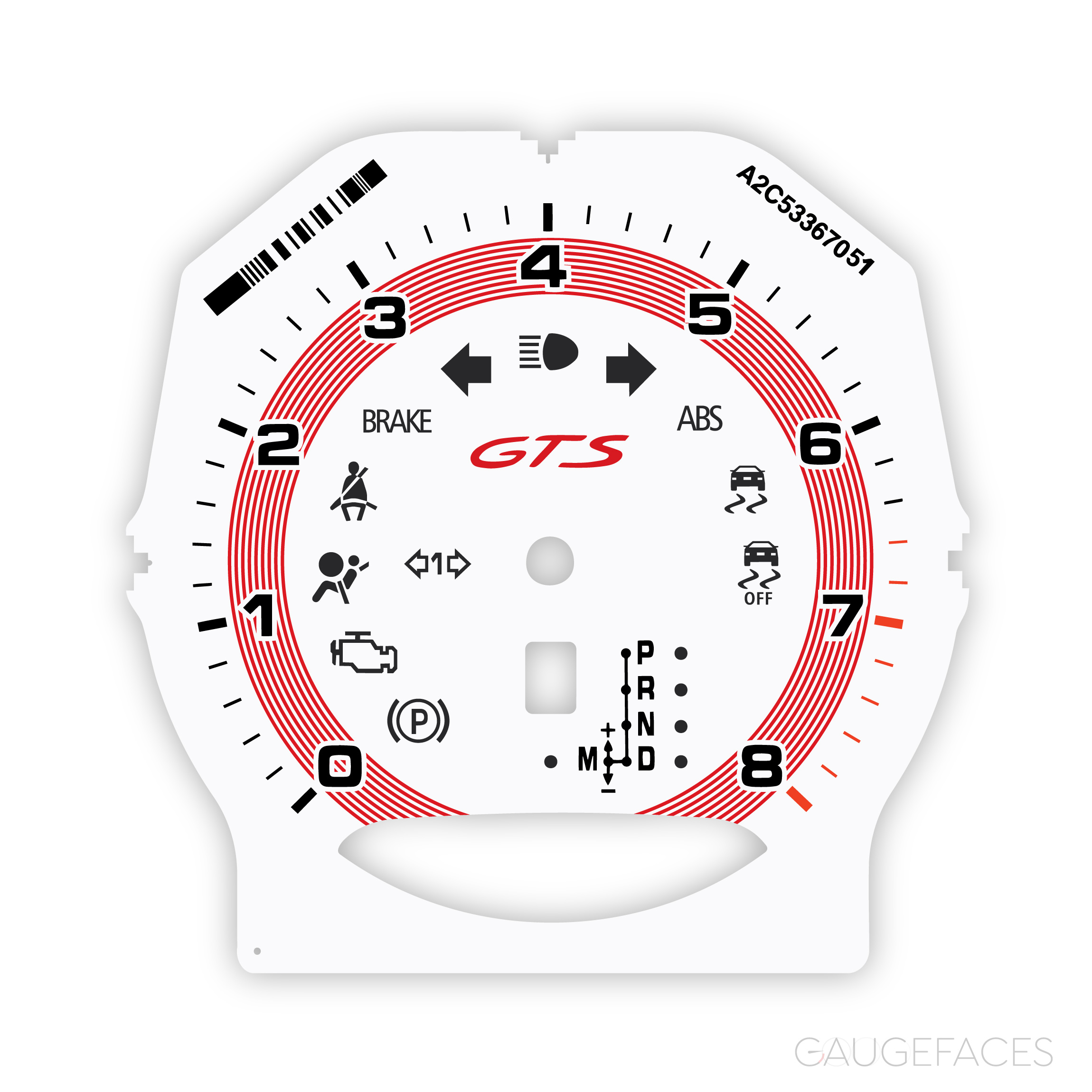 Porsche 958 Cayenne GTS / 970 Panamera GTS instrument cluster gauge face with GTS logo, for 8000 RPM, PDK – White with Red Ring.