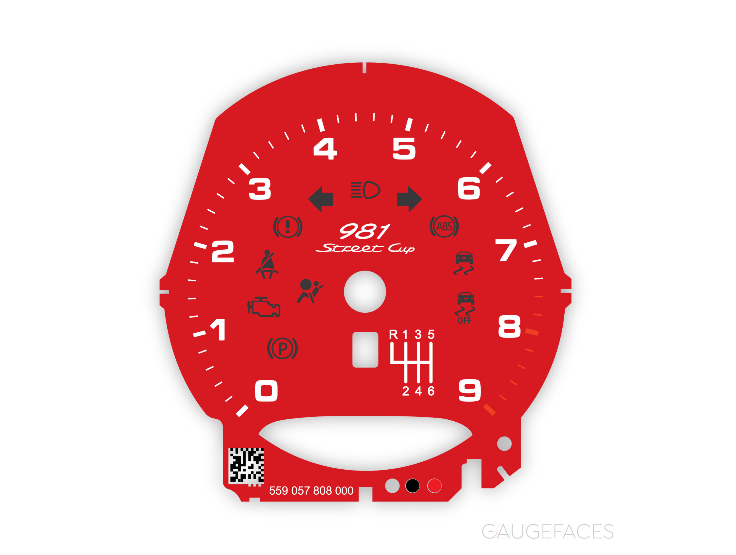 Porsche 981 Boxster & Cayman gauge face tachometer – 981 Street Cup Logotype – 9000 RPM, Manual transmission – Guards Red.