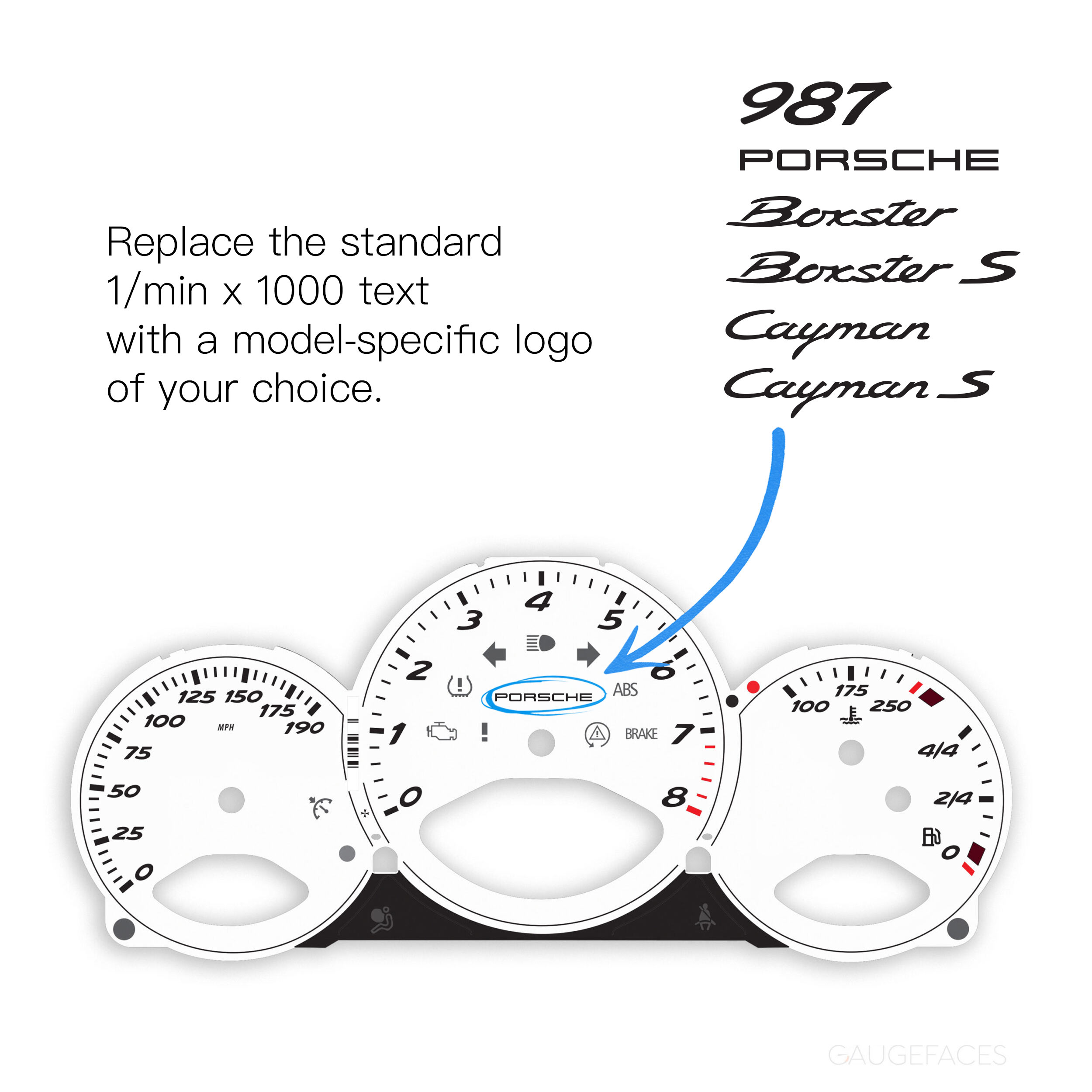 Porsche 987 Boxster / Cayman – instrument cluster gauge face – White (OEM font).