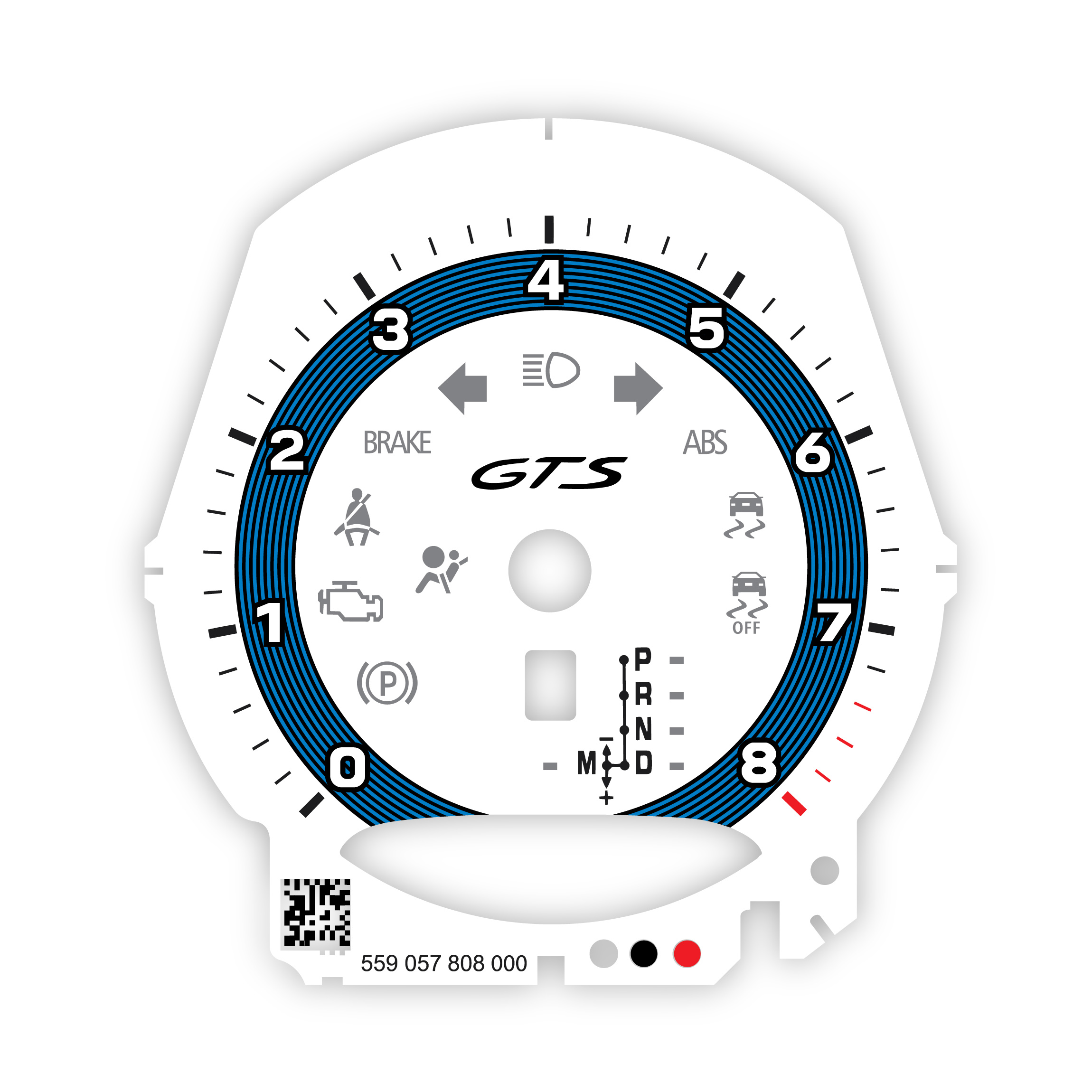 Porsche 911 991.2 GTS / 718 GTS 2.5L gauge face tachometer with GTS logo, for 9000 RPM – White with Shark Blue Solid Accent Ring (992 Style font of the numbers).