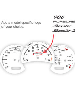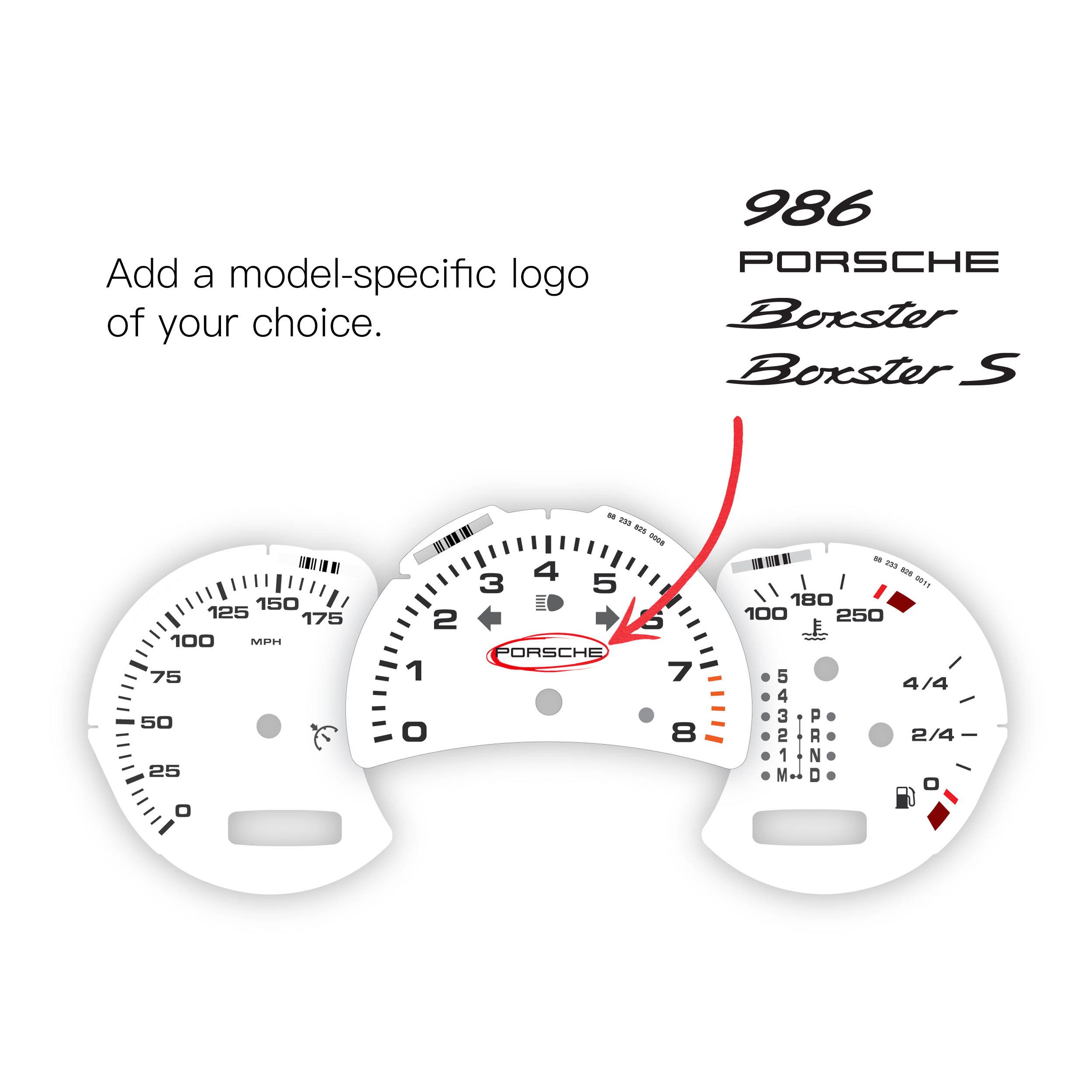 Instrument gauge faces set Porsche Boxster 986 (Gen 1&2) – 8000 RPM – Manual/Tiptronic – White (911 Blockstyle font).